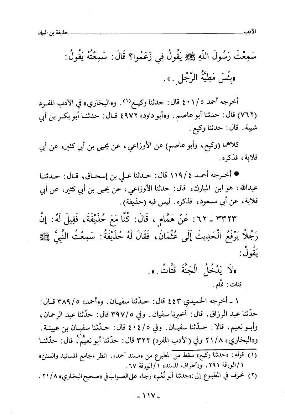 ٣٣٢٣ - عَنْ هَمَّامٍ، قَالَ: كُنَّا مَعَ حُذَيْفَةَ، فَقِيلَ لَهُ: إِنَّ رَجُلاً يَرْفَعُ الْحَدِيثَ إِلَى عُثْمَانَ. فَقَالَ لَهُ حُذَيْفَةُ: سَمِعْتُ النَّبِيَّ صلى الله عليه وسلم يَقُولُ: