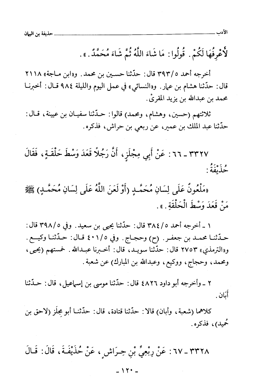 ٣٣٢٧ - عَنْ أَبِي مِجْلَزٍ، أَنَّ رَجُلاً قَعَدَ وَسْطَ حَلْقَةٍ، فَقَالَ حُذَيْفَةُ: