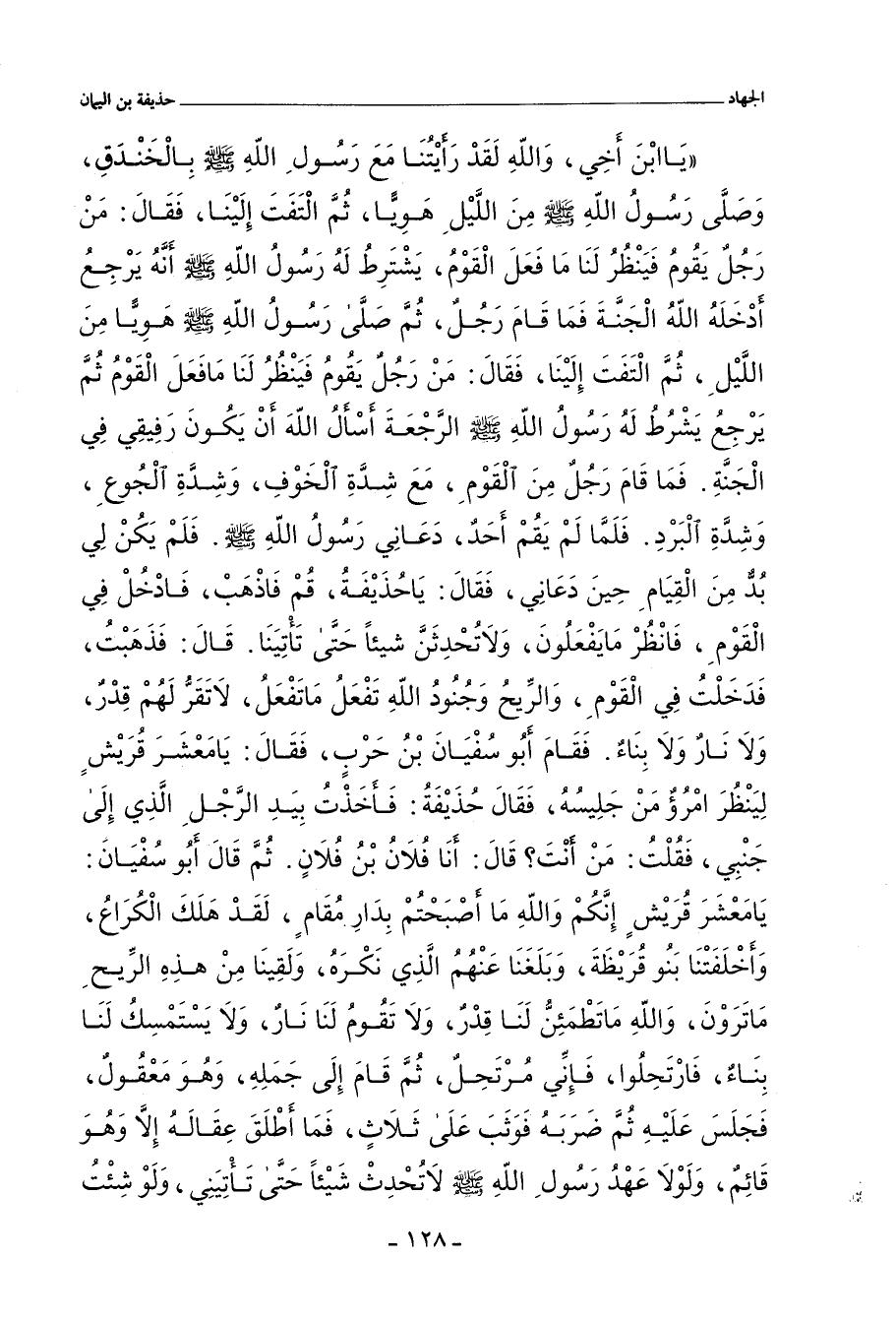 يَا ابْنَ أَخِي , وَاللهِ، لَقَدْ رَأَيْتُنَا مَعَ رَسُولِ اللهِ صلى الله عليه وسلم بِالْخَنْدَقِ , وَصَلَّى رَسُولُ اللهِ صلى الله عليه وسلم هَوِيًّا مِنَ اللَّيْلِ , ثُمَّ الْتَفَتَ إِلَيْنَا , فَقَالَ: مَنْ رَجُلٌ يَقُومُ فَيَنْظُرَُ لَنَا مَا فَعَلَ الْقَوْمُ , يَشْتَرِطُ لَهُ رَسُولُ اللهِ صلى الله عليه وسلم أَنَّهُ يَرْجِعُ , أَدْخَلَهُ اللَّهُ الْجَنَّةَ , فَمَا قَامَ رَجُلٌ , ثُمَّ صَلَّى رَسُولُ اللهِ صلى الله عليه وسلم هَوِيًّا مِنَ اللَّيْلِ , ثُمَّ الْتَفَتَ إِلَيْنَا , فَقَالَ: مَنْ رَجُلٌ يَقُومُ فَيَنْظُرَُ لَنَا مَا فَعَلَ الْقَوْمُ , ثُمَّ يَرْجِعُ يَشْرُِطُ لَهُ رَسُولُ اللهِ صلى الله عليه وسلم الرَّجْعَةَ , أَسْأَلُ اللهَ أَنْ يَكُونَ رَفِيقِي فِي الْجَنَّةِ , فَمَا قَامَ رَجُلٌ مِنَ الْقَوْمِ , مِنْ شِدَّةِ الْخَوْفِ , وَشِدَّةِ الْجُوعِ , وَشِدَّةِ الْبَرْدِ , فَلَمَّا لَمْ يَقُمْ أَحَدٌ , دَعَانِي رَسُولُ اللهِ صلى الله عليه وسلم , فَلَمْ يَكُنْ لِي بُدٌّ مِنَ الْقِيَامِ حِينَ دَعَانِي , فَقَالَ: يَا حُذَيْفَةُ , اذْهَبْ , فَادْخُلْ فِي الْقَوْمِ , فَانْظُرْ مَا يَفْعَلُونَ , وَلَا تُحْدِثَنَّ شَيْئًا حَتَّى تَأْتِيَنَا. قَالَ: فَذَهَبْتُ , فَدَخَلْتُ فِي الْقَوْمِ , وَالرِّيحُ وَجُنُودُ اللهِ تَفْعَلُ بِهِمْ مَا تَفْعَلُ , لَا تَقَِرُّ لَهُمْ قِدْرٌ , وَلَا نَارٌ , وَلَا بِنَاءٌ , فَقَامَ أَبُو سُفْيانَ بْنُ حَرْب , فَقَالَ: يَا مَعْشَرَ قُرَيْشٍ , لِيَنْظُرِ امْرُؤٌ مَنْ جَلِيسُهُ , فَقَالَ حُذَيْفَةُ: فَأَخَذْتُ بِيَدِ الرَّجُلِ الَّذِي إِلَى جَنْبِي , فَقُلْتُ: مَنْ أَنْتَ؟ قَالَ: أَنَا فُلَانُ بْنُ فُلَانٍ. ثُمَّ قَالَ أَبُو سُفْيانَ: يَا مَعْشَرَ قُرَيْشٍ , إِنَّكُمْ وَاللهِ، مَا أَصْبَحْتُمْ بِدَارِ مُقَامٍ , لَقَدْ هَلَكَ