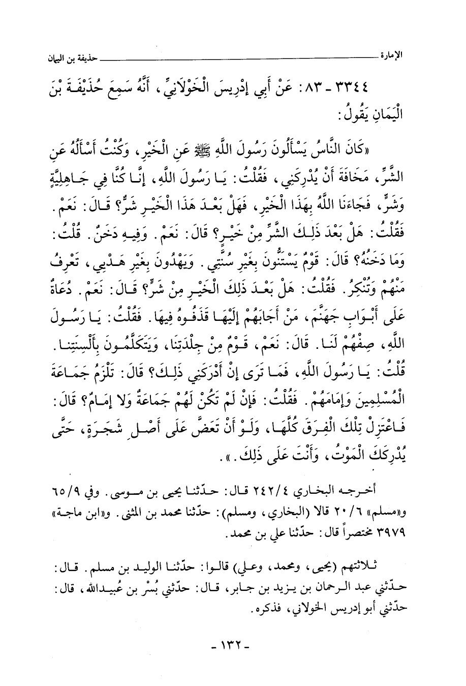 كَانَ النَّاسُ يَسْأَلُونَ رَسُولَ اللهِ صلى الله عليه وسلم عَنِ الْخَيْرِ، وَكُنْتُ أَسْأَلُهُ عَنِ الشَّرِّ، مَخَافَةَ أَنْ يُدْرِكَنِي , فَقُلْتُ: يَا رَسُولَ اللهِ , إِنَّا كُنَّا فِي جَاهِلِيَّةٍ وَشَرٍّ , فَجَاءَنَا اللَّهُ بِهَذَا الْخَيْرِ، فَهَلْ بَعْدَ هَذَا الْخَيْرِ شَرٌّ؟ قَالَ: نَعَمْ , فَقُلْتُ: هَلْ بَعْدَ ذَلِكَ الشَّرِّ مِنْ خَيْرٍ , قَالَ: نَعَمْ، وَفِيهِ دَخَنٌ. قُلْتُ: وَمَا دَخَنُهُ؟ قَالَ:: قَوْمٌ يَسْتَنُّونَ بِغَيْرِ سُنَّتِي , وَيَهْدُونَ بِغَيْرِ هَدْيِِي، تَعْرِفُ مِنْهُمْ وَتُنْكِرُ. فَقُلْتُ: هَلْ بَعْدَ ذَلِكَ الْخَيْرِ مِنْ شَرٍّ؟ قَالَ: نَعَمْ، دُعَاةٌ عَلَى أَبْوَابِ جَهَنَّمَ، مَنْ أَجَابَهُمْ إِلَيْهَا قَذَفُوهُ فِيهَا. فَقُلْتُ: يَا رَسُولَ اللهِ , صِفْهُمْ لَنَا. قَالَ: نَعَمْ، قَوْمٌ مِنْ جِلْدَتِنَا، وَيَتَكَلَّمُونَ بِأَلْسِنَتِنَا. قُلْتُ: يَا رَسُولَ اللهِ , فَمَا تَرَى إِنْ أَدْرَكَنِي ذَلِكَ؟ قَالَ: تَلْزَمُ جَمَاعَةَ الْمُسْلِمِينَ وَإِمَامَهُمْ. فَقُلْتُ: فَإِنْ لَمْ تَكُنْ لَهُمْ جَمَاعَةٌ وَلَا إِمَامٌ؟ قَالَ: فَاعْتَزِلْ تِلْكَ الْفِرَقَ كُلَّهَا، وَلَوْ أَنْ تَعَضَّ عَلَى أَصْلِ شَجَرَةٍ، حَتَّى يُدْرِكَكَ الْمَوْتُ، وَأَنْتَ عَلَى ذَلِكَ.