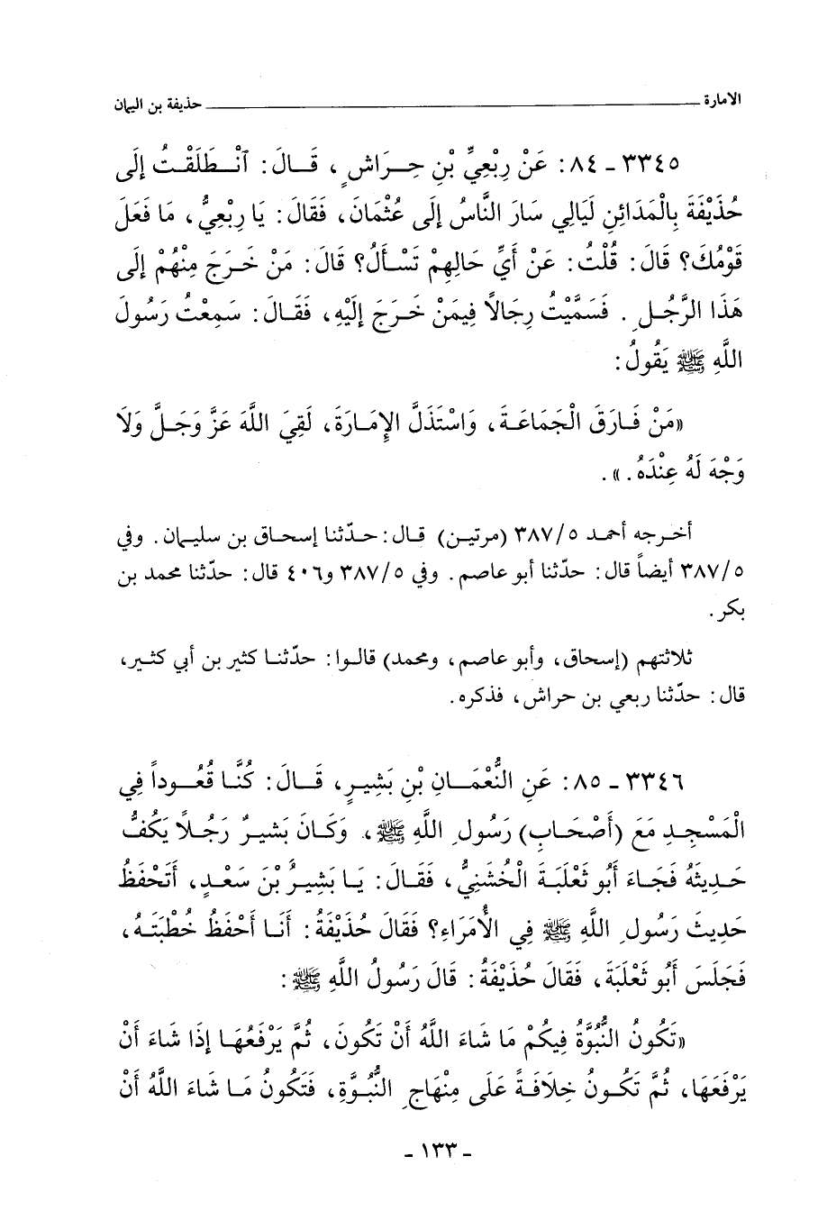 ٣٣٤٥ - عَنْ رِبْعِيِّ بْنِ حِرَاشٍ , قَالَ: انْطَلَقْتُ إِلَى حُذَيْفَةَ بِالْمَدَائِنِ لَيَالِيَ سَارَ النَّاسُ إِلَى عُثْمَانَ , فَقَالَ: يَا رِبْعِيُّ , مَا فَعَلَ قَوْمُكَ؟ قَالَ: قُلْتُ: عَنْ أَيِّ حَالِهِمْ تَسْأَلُ؟ قَالَ: مَنْ خَرَجَ مِنْهُمْ إِلَى هَذَا الرَّجُلِ. فَسَمَّيْتُ رِجَالاً فِيمَنْ خَرَجَ إِلَيْهِ , فَقَالَ: سَمِعْتُ رَسُولَ اللهِ صلى الله عليه وسلم يَقُولُ: