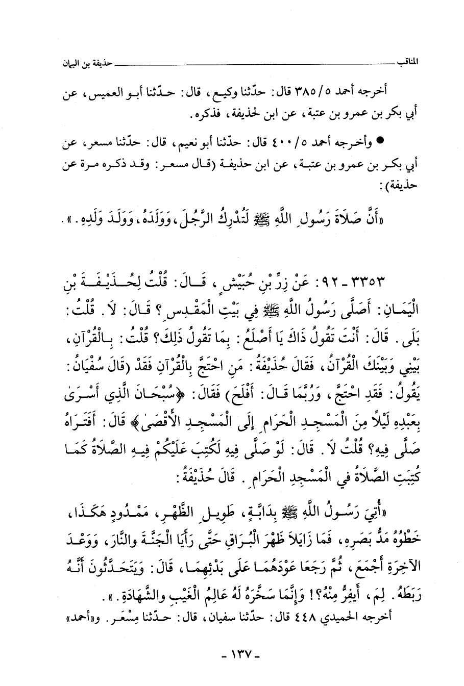 قَالَ زِرٌّ: فَقُلْتُ: بَلَى قَدْ صَلَّى. قَالَ حُذَيْفَةُ: مَا اسْمُكَ يَا أَصْلَعُ؟ فَإِنِّي أَعْرِفُ وَجْهَكَ، وَلَا أَدْرِى مَا اسْمُكَ. قَالَ: قُلْتُ: أَنَا زِرُّ بْنُ حُبَيْشٍ، قَالَ: وَمَا يُدْرِيكَ؟ وَهَلْ تَجِدُهُ صَلَّى، قَالَ: قُلْتُ: لِقَوْلِ اللهِ، عَزَّ وَجَلَّ: (سُبْحَانَ الَّذِي أَسْرَى بِعَبْدِهِ) الآيَةَ. قَالَ: وَهَلْ تَجِدُهُ صَلَّى؟ لَو صَلَّى فِيهِ، صَلَّيْنَا فِيهِ، كَمَا نُصَلِّي فِي الْمَسْجِدِ الْحَرَامِ، وَقِيلَ لِحُذَيْفَةَ: رَبَطَ الدَّابَّةَ بِالْحَلْقَةِ الَّتِي يَرْبِطَ بِهَا الأَنْبِيَاءُ، فَقَالَ حُذَيْفَةُ: أَوَ كَانَ يَخَافُ أَنْ تَذْهَبَ، وَقَدْ آتَاهُ اللَّهُ بِهَا.