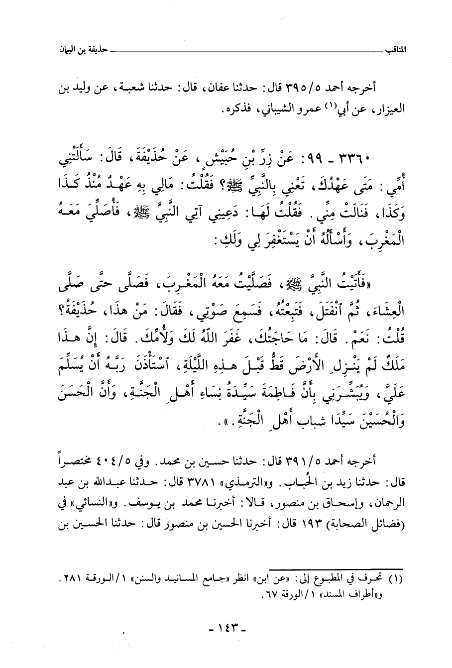 سَأَلَتْنِي أُمِّي: مُنْذُ مَتَى عَهْدُكَ بِالنَّبِيِّ صلى الله عليه وسلم؟ قَالَ: فَقُلْتُ لَهَا: مُنْذُ كَذَا وَكَذَا، قَالَ: فَنَالَتْ مِنِّي وَسَبَّتْنِي، قَالَ: فَقُلْتُ لَهَا: دَعِينِي، فَإِنِّي آتِي النَّبِيَّ صلى الله عليه وسلم، فَأُصَلِّي مَعَهُ الْمَغْرِبَ، ثُمَّ لَا أَدَعُهُ حَتَّى يَسْتَغْفِرَ لِي وَلَكِ، قَالَ: فَأَتَيْتُ النَّبِيَّ صلى الله عليه وسلم، فَصَلَّيْتُ مَعَهُ الْمَغْرِبَ، فَصَلَّى النَّبِيُّ صلى الله عليه وسلم الْعِشَاءَ، ثُمَّ انْفَتَلَ، فَتَبِعْتُهُ، فَعَرَضَ لَهُ عَارِضٌ، فَنَاجَاهُ، ثُمَّ ذَهَبَ، فَاتَّبَعْتُهُ، فَسَمِعَ صَوْتِي، فَقَالَ: مَنْ هَذَا؟ فَقُلْتُ: حُذَيْفَةُ، قَالَ: مَا لَكَ؟ فَحَدَّثْتُهُ بِالأَمْرِ، فَقَالَ: غَفَرَ اللَّهُ لَكَ وَلأُمِّكَ، ثُمَّ قَالَ: أَمَا رَأَيْتَ الْعَارِضَ الَّذِي عَرَضَ لِي قُبَيْلُ؟ قَالَ: قُلْتُ: بَلَى، قَالَ: فَهُوَ مَلَكٌ مِنَ الْمَلَائِكَةِ، لَمْ يَهْبِطِ الأَرْضَ قَبْلَ هَذِهِ اللَّيْلَةِ، اسْتَأْذَنَ رَبَّهُ أَنْ يُسَلِّمَ عَلَيَّ، وَيُبَشِّرَنِي أَنَّ الحَسَن وَالْحُسَيْنَ سَيِّدَا شَبَابِ أَهْلِ الْجَنَّةِ، وَأَنَّ فَاطِمَةَ سَيِّدَةُ نِسَاءِ أَهْلِ الْجَنَّةِ، رَضِيَ اللَّهُ عَنْهُمْ.