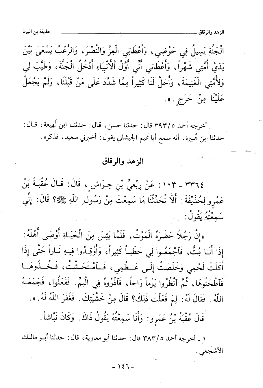 ٣٣٦٤ - عَنْ رِبْعِيِّ بْنِ حِرَاشٍ، قَالَ: قَالَ عُقْبَةُ بْنُ عَمْرٍو لِحُذَيْفَةَ: أَلَا تُحَدِّثُنَا مَا سَمِعْتَ مِنْ رَسُولِ اللهِ صلى الله عليه وسلم؟ قَالَ: إِنِّي سَمِعْتُهُ يَقُولُ: