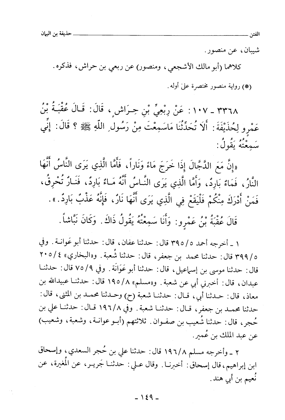 ٣٣٦٨ - عَنْ رِبْعِيِّ بْنِ حِرَاشٍ، قَالَ: قَالَ عُقْبَةُ بْنُ عَمْرٍو لِحُذَيْفَةَ: أَلَا تُحَدِّثُنَا مَا سَمِعْتَ مِنْ رَسُولُ صلى الله عليه وسلم؟ قَالَ: إِنِّي سَمِعْتُهُ يَقُولُ: