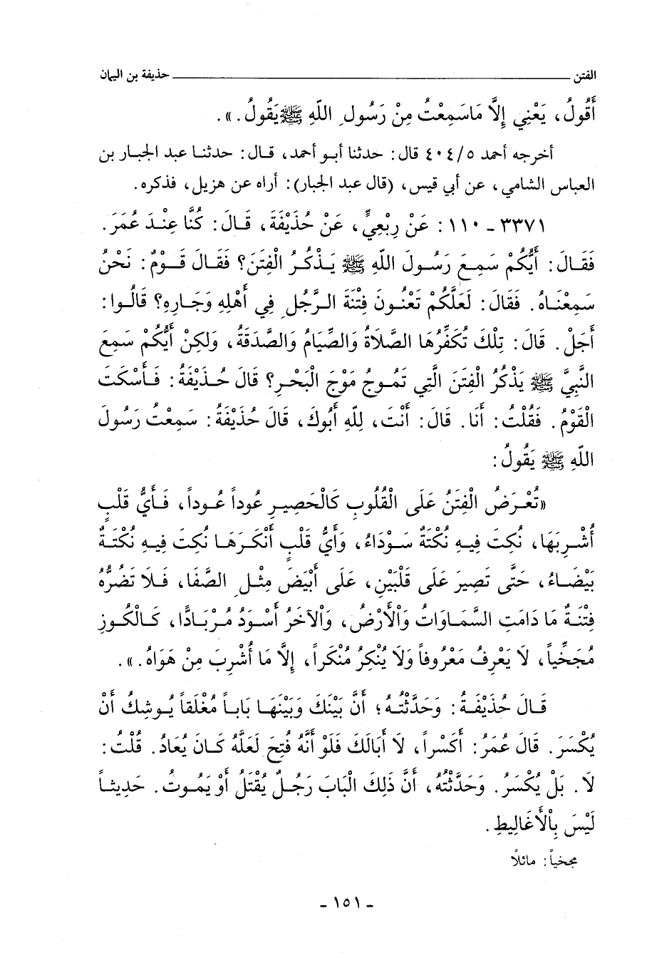 ٣٣٧١ - عَنْ رِبْعِيِّ بْنِ حِرَاشٍ، عَنْ حُذَيْفَةَ، قَالَ: كُنَّا عِنْدَ عُمَرَ، فَقَالَ: أَيُّكُمْ سَمِعَ رَسُولَ اللهِ صلى الله عليه وسلم يَذْكُرُ الْفِتَنَ؟ فَقَالَ قَوْمٌ: نَحْنُ سَمِعْنَاهُ، فَقَالَ: لَعَلَّكُمْ تَعْنُونَ فِتْنَةَ الرَّجُلِ فِي أَهْلِهِ وَجِارِهِ؟ قَالُوا: أَجَلْ، قَالَ: تِلْكَ تُكَفِّرُهَا الصَّلَاةُ، وَالصِّيَامُ، وَالصَّدَقَةُ، وَلَكِنْ أَيُّكُمْ سَمِعَ النَّبِيَّ صلى الله عليه وسلم يَذْكُرُ الْفِتَنَ الَّتِي تَمُوجُ مَوْجَ الْبَحْرِ؟ قَالَ حُذَيْفَةُ: فَأَسْكَتَ الْقَوْمُ، فَقُلْتُ: أَنَا، قَالَ: أَنْتَ، ِللهِ أَبُوكَ، قَالَ حُذَيْفَةُ: سَمِعْتُ رَسُولَ اللهِ صلى الله عليه وسلم يَقُولُ: