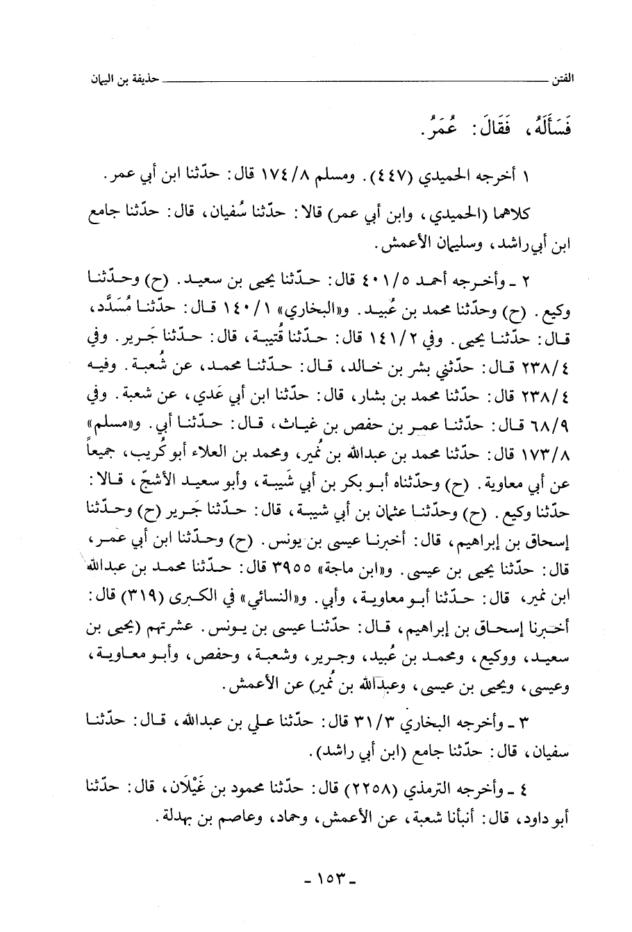 أخرجه الحُمَيْدِي (٤٤٧) قال: حدَّثنا سُفْيان، قال: حدَّثنا جامع بن أَبي راشد، وسُلَيْمَان الأَعْمَش. و"أحمد" ٥/ ٤٠١ (٢٣٨٠٤) قال: حدَّثنا يَحيى بن سَعِيد، عن الأَعْمَش. وفي (٢٣٨٠٥) قال: حدَّثنا وَكِيع، عن الأَعْمَش. وفي (٢٣٨٠٦) قال: حدَّثنا مُحَمد بن عُبَيْد، عن الأَعْمَش. و"البُخَارِي" ١/ ١٤٠ (٥٢٥) قال: حدَّثنا مُسَدَّد، قال: حدَّثنا يَحيى، عن الأَعْمَش. وفي ٢/ ١٤١ (١٤٣٥) قال: حدَّثنا قُتَيْبَة، حدَّثنا جَرِير، عن الأَعْمَش. وفي ٣/ ٣١ (١٨٩٥) قال: حدَّثنا علي بن عَبْد الله، حدَّثنا سُفْيان، حدَّثنا جامع. وفي ٤/ ٢٣٨ (٣٥٨٦) قال: حدَّثنا مُحَمد بن بَشَّار، حدَّثنا ابن أَبي عَدِي، عن شُعْبة (ح) وحدَّثني بِشْر بن خالد، حدَّثنا مُحَمد، عن شُعْبة، عن سُلَيْمَان. وفي ٩/ ٦٨ (٧٠٩٦) قال: حدَّثنا عُمَر بن حَفْص بن غِيَاث، حدَّثنا أَبي، حدَّثنا الأَعْمَش. و"مسلم" ٨/ ١٧٣ (٧٣٧١) قال: حدَّثنا مُحَمد بن عَبْد اللهِ بن نُمَيْر، ومُحَمد بن العَلَاء، أبو كُرَيْب، جميعًا عن أَبي مُعَاوِيَة، قال ابن العَلَاء: حدَّثنا أبو مُعَاوِيَة، حدَّثنا الأَعْمَش. وفي (٧٣٧٢) قال: حدَّثناه أبو بَكْر بن أَبي شَيْبَة، وأبو سَعِيد الأَشَجّ، قالا: حدَّثنا وَكِيع (ح) وحدَّثنا عُثْمان بن أَبي شَيْبَة، حدَّثنا جَرِير (ح) وحدَّثنا إِسْحَاق بن إبراهيم، أخبرنا عِيسَى بن يُونُس (ح) وحدَّثنا ابن أَبي عُمَر، حدَّثنا يَحيى بن عِيسَى، كلهم عن الأَعْمَش. وفي ٨/ ١٧٤ (٧٣٧٣) قال: حدَّثنا ابن أَبي عُمَر، حدَّثنا سُفْيان، عن جامع بن أَبي راشد، والأَعْمَش. و"ابن ماجة" ٣٩٥٥ قال: حدَّثنا مُحَمد بن عَبْد اللهِ بن نُمَيْر، حدَّثنا أبو مُعَاوِيَة وأَبي، عن الأَعْمَش. والتِّرْمِذِيّ" ٢٢٥٨ قال: حدَّثنا محمود بن غَيْلَان، حدَّثنا أبو داود، أنبأنا شُعْبة، عن الأَعْمَش، وحَمَّاد، وعاصم بن بَهْدَلَة.