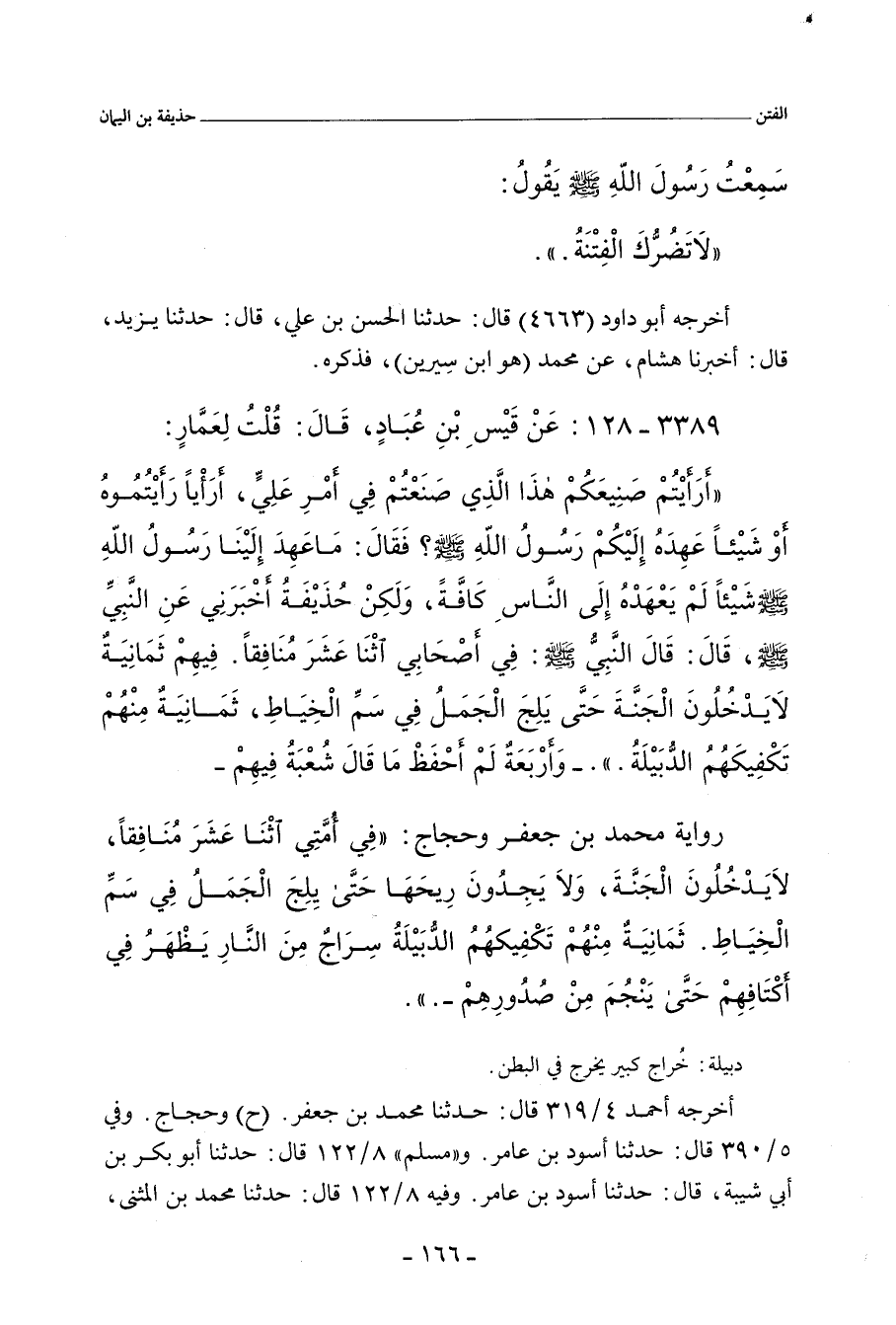 ٣٣٨٩ - عَنْ قَيْسِ بْنِ عُبَادٍ , قَالَ: قُلْتُ لِعَمَّارٍ: أَرَأَيْتُمْ صَنِيعَكُمْ هَذَا الَّذِي صَنَعْتُمْ فِي أَمْرِ عَلِىٍّ , أَرَأْيًا رَأَيْتُمُوهُ , أَوْ شَيْئًا عَهِدَهُ إِلَيْكُمْ رَسُولُ اللهِ صلى الله عليه وسلم؟ فَقَالَ: مَا عَهِدَ إِلَيْنَا رَسُولُ اللهِ صلى الله عليه وسلم شَيْئًا لَمْ يَعْهَدْهُ إِلَى النَّاسِ كَافَّةً , وَلَكِنْ حُذَيْفَةُ أَخْبَرَنِي، عَنِ النَّبِيِّ صلى الله عليه وسلم , قَالَ: قَالَ النَّبِيُّ صلى الله عليه وسلم:
