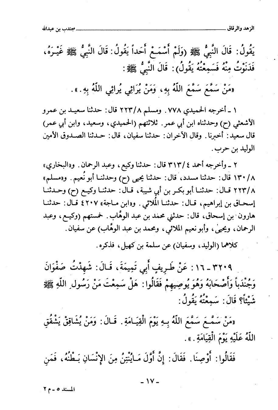 أخرجه الحُمَيْدِي (٧٧٨) قال: حدَّثنا سُفْيان، قال: حدَّثنا الوَلِيد بن حَرْب الصَّدوق الأَمين. و"أحمد" ٤/ ٣١٣ (١٩٠١٤) قال: حدَّثنا وَكِيع، وعَبْد الرَّحْمان، قالا: حدَّثنا سُفْيان. و"البُخَارِي" ٨/ ١٣٠ (٦٤٩٩) قال: حدَّثنا مُسَدَّد، حدَّثنا يَحيى، عن سُفْيان (ح) وحدَّثنا أبو نُعَيْم، حدَّثنا سُفْيان. و"مسلم" ٨/ ٢٢٣ (٧٥٨٦) قال: حدَّثنا أبو بَكْر بن أَبي شَيْبَة، حدَّثنا وَكِيع، عن سُفْيان. وفي (٧٥٨٧) قال: وحدَّثنا إِسْحَاق بن إبراهيم، حدَّثنا المُلَائي، حدَّثنا سُفْيان. وفي (٧٥٨٨) قال: حدَّثنا سَعِيد بن عَمْرو الأَشْعَثِي، أَخبرنا سُفْيان، عن الوَلِيد بن حَرْب (قال سَعِيد: أَظنُّه قال: ابن الحارث بن أَبي مُوسَى). وفي (٧٥٨٩) قال: وحدَّثناه ابن أَبي عُمَر، حدَّثنا سُفْيان، حدَّثنا الصَّدوق الأَمين الوَلِيد بن حَرْب. و"ابن ماجة" ٤٢٠٧ قال: حدَّثنا هارون بن إِسْحَاق، حدَّثني مُحَمَّد بن عَبْد الوَهَّاب، عن سُفْيان.