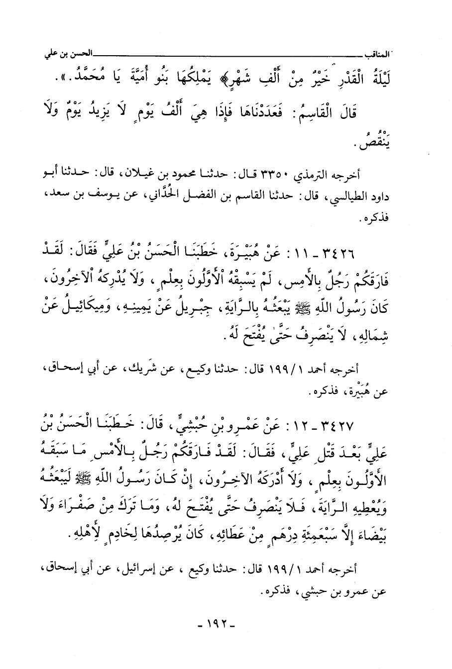 ٣٤٢٦ - عَنْ هُبَيْرَةَ بْنِ يَرِيمَ؛ خَطَبَنَا الْحَسَنُ بْنُ عَلِىٍّ، رَضِيَ اللهُ عَنْهُ، فَقَالَ: لَقَدْ فَارَقَكُمْ رَجُلٌ بِالأَمْسِ، لَمْ يَسْبِقْهُ الأَوَّلُونَ بِعَلْمٍ، وَلَا يُدْرِكُهُ الآخِرُونَ، كَانَ رَسُولُ اللهِ صلى الله عليه وسلم يَبْعَثُهُ بِالرَّايَةِ، جِبْرِيلُ عَنْ يَمِينِهِ، وَمِيكَائِيلُ عَنْ شِمَالِهِ، لَا يَنْصَرِفُ حَتَّى يُفْتَحَ لَهُ.