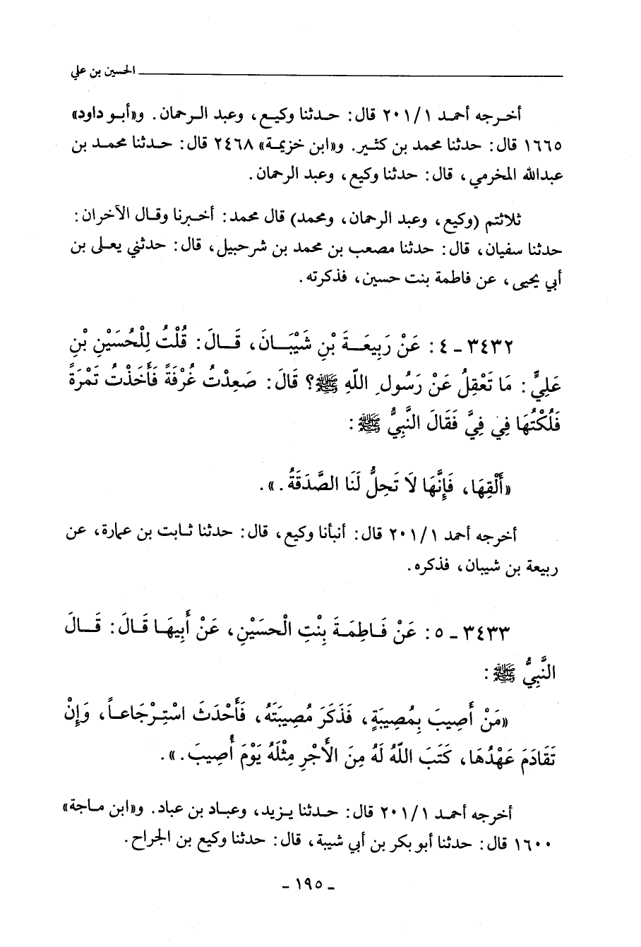 ثلاثتهم (وَكِيع، وعَبْد الرَّحْمان، ومُحَمد) عن سُفْيان الثَّوْرِي، حدَّثنا مُصْعَب بن مُحَمد بن شُرَحْبِيل، حدَّثنا يَعْلَى بن أَبِي يَحيى، عن فاطمة بنت حُسَيْن، فذكرته.