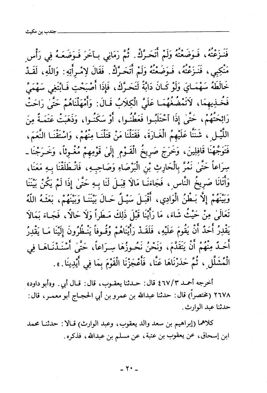 فَنَزَعْتُهُ فَوَضَعْتُهُ وَلَمْ أَتَحَرَّكْ، ثُمَّ رَمَانِي بِآخَرَ فَوَضَعَهُ فِي رَأْسِ مَنْكِبِي، فَنَزَعْتُهُ فَوَضَعْتُهُ وَلَمْ أَتَحَرَّكْ، فَقَالَ لاِمْرَأَتِهِ: وَاللهِ، لَقَدْ خَالَطَهُ سَهْمَايَ، وَلَوْ كَانَ دَابَّةً لَتَحَرَّكَ، فَإِذَا أَصْبَحْتِ فَابْتَغِي سَهْمَيَّ فَخُذِيهِمَا، لَا تَمْضُغُهُمَا عَلَيَّ الْكِلَابُ. قَالَ: وَأَمْهَلْنَاهُمْ حَتَّى رَاحَتْ رَائِحَتُهُمْ، حَتَّى إِذَا احْتَلَبُوا وَعَطَنُوا، أَوْ سَكَنُوا، وَذَهَبَتْ عَتَمَةٌ مِنْ اللَّيْلِ، شَنَنَّا عَلَيْهِمْ الْغَارَةَ، فَقَتَلْنَا مَنْ قَتَلْنَا مِنْهُمْ، وَاسْتَقْنَا النَّعَمَ، فَتَوَجَّهْنَا قَافِلِينَ، وَخَرَجَ صَرِيخُ الْقَوْمِ إِلَى قَوْمِهِمْ مُغَوِّثًا، وَخَرَجْنَا سِرَاعًا، حَتَّى نَمُرَّ بِالْحَارِثِ بْنِ الْبَرْصَاءِ وَصَاحِبِهِ، فَانْطَلَقْنَا بِهِ مَعَنَا، وَأَتَانَا صَرِيخُ النَّاسِ، فَجَاءَنَا مَا لَا قِبَلَ لَنَا بِهِ، حَتَّى إِذَا لَمْ يَكُنْ بَيْنَنَا وَبَيْنَهُمْ إِلَاّ بَطْنُ الْوَادِي، أَقْبَلَ سَيْلٌ حَالَ بَيْنَنَا وَبَيْنَهُمْ، بَعَثَهُ اللَّهُ، تَعَالَى، مِنْ حَيْثُ شَاءَ، مَا رَأَيْنَا قَبْلَ ذَلِكَ مَطَرًا وَلَا حَالاً، فَجَاءَ بِمَا لَا يَقْدِرُ أَحَدٌ أَنْ يَقُومَ عَلَيْهِ، فَلَقَدْ رَأَيْنَاهُمْ وُقُوفًا يَنْظُرُونَ إِلَيْنَا، مَا يَقْدِرُ أَحَدٌ مِنْهُمْ أَنْ يَتَقَدَّمَ، وَنَحْنُ نُحَوِّزُهَا سِرَاعًا، حَتَّى أَسْنَدْنَاهَا فِي الْمُشَلَّلِ، ثُمَّ حَدَرْنَاهَا عَنَّا، فَأَعْجَزْنَا الْقَوْمَ بِمَا فِي أَيْدِينَا.
