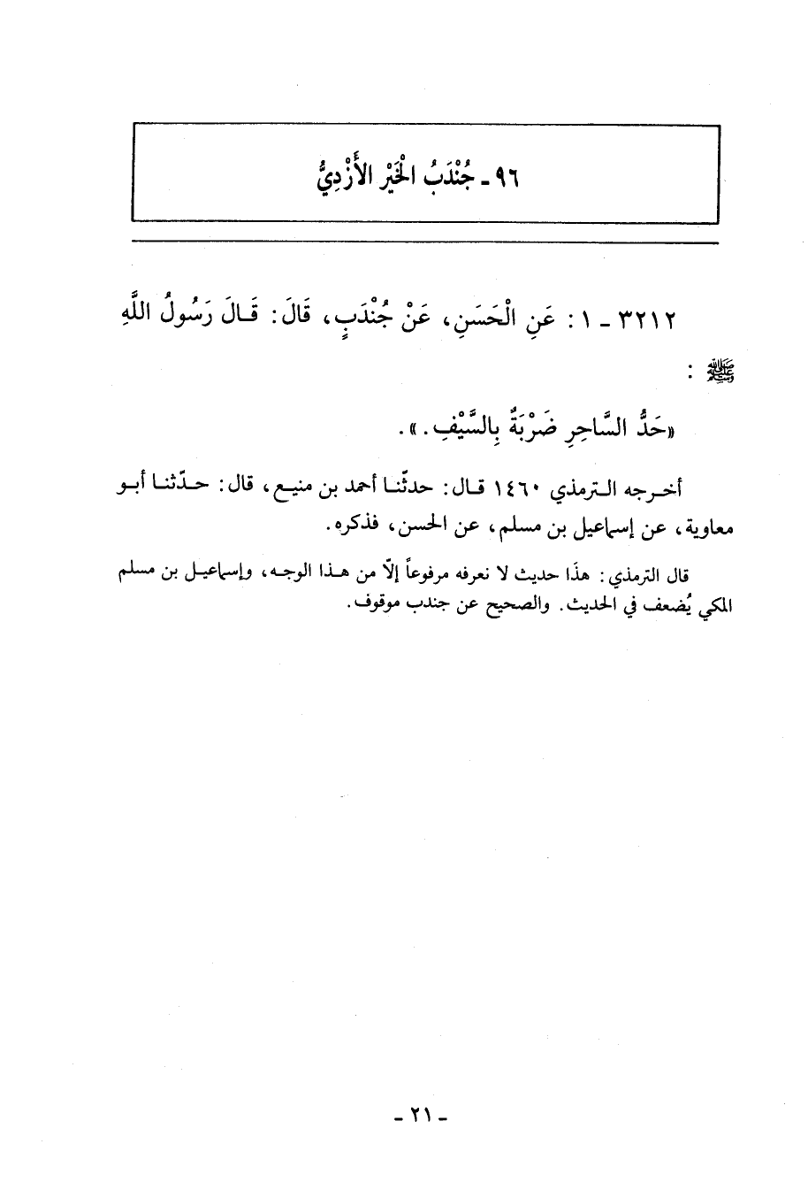 - قال أبو عِيسَى التِّرْمِذِي: هذا حديثٌ لا نعرفُه مَرْفُوعًا إلا من هذا الوجه، وإِسْمَاعِيل بن مُسْلم المَكِّي يُضَعَّفُ في الحديثِ، والصَّحيح عن جُنْدَُب مَوْقُوفٌ.