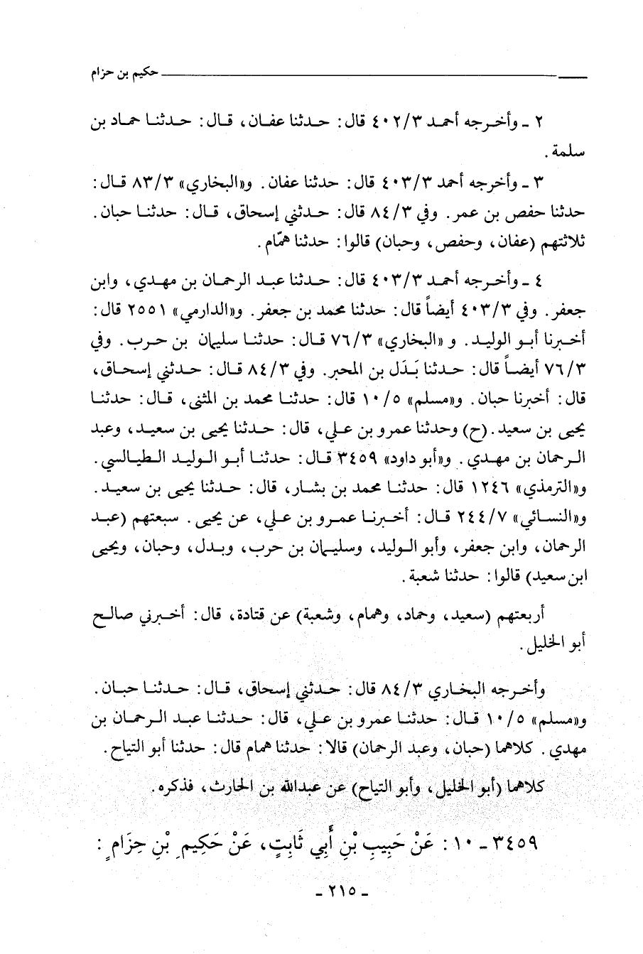 وفي ٣/ ٤٠٢ (١٥٣٩٦) قال: حدَّثنا عَفَّان، حدَّثنا حَمَّاد بن سَلَمَة. وفي ٣/ ٤٠٣ (١٥٣٩٨) قال: حدَّثنا عَفَّان، حدَّثنا هَمَّام. وفي (١٥٣٩٩ و ١٥٤٠٢) قال: حدَّثنا مُحَمد بن جَعْفَر، حدَّثنا سَعِيد. وفي (١٥٤٠١) قال: حدَّثنا عَبْد الرَّحْمان بن مَهْدِي، وابن جَعْفَر، قالا: حدَّثنا شُعْبة. و"الدارِمِي" ٢٥٤٧ قال: أخبرنا سَعِيد بن عامر، عن سَعِيد. وفي (٢٥٤٨) قال: أخبرنا أبو الوَلِيد، حدَّثنا شُعْبة. و"البُخَارِي" ٣/ ٧٦ (٢٠٧٩) قال: حدَّثنا سُلَيْمَان بن حَرْب، حدَّثنا شُعْبة. وفي (٢٠٨٢) قال: حدَّثنا بَدَل بن المُحَبَّر، حدَّثنا شُعْبة. وفي ٣/ ٨٣ (٢١٠٨) قال: حدَّثنا حَفْص بن عُمَر، حدَّثنا هَمَّام. وفي ٣/ ٨٤ (٢١١٠) قال: حدَّثني إِسْحَاق، أخبرنا حبَّان، حدَّثنا شُعْبة. وفي (٢١١٤) قال: حدَّثني إِسْحَاق، حدَّثنا حبَّان، حدَّثنا هَمَّام. و"مسلم" ٥/ ١٠ (٣٨٥٣) قال: حدَّثنا مُحَمد بن المُثَنَّى، حدَّثنا يَحيى ين سَعِيد، عن شُعْبة (ح) وحدَّثنا عَمْرو بن علي، حدَّثنا يَحيى بن سَعِيد، وعَبْد الرَّحْمان بن مَهْدِي، قالا: حدَّثنا شُعْبة. و"أبو داود" ٣٤٥٩ قال: حدَّثنا أبو الوَلِيد الطَّيَالِسِي، حدَّثنا شُعْبة. والتِّرْمِذِيّ" ١٢٤٦ قال: حدَّثنا مُحَمد بن بَشَّار، حدَّثنا يَحيى بن سَعِيد، عن شُعْبة. و"النَّسائي" ٧/ ٢٤٤