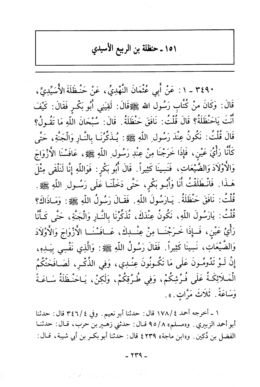 ٣٤٩٠ - عَنْ أَبِي عُثْمَانَ النَّهْدِيِّ، عَنْ حَنْظَلَةَ الأُسَيِّدِيِّ , قَالَ: وَكَانَ مِنْ كُتَّابِ رَسُولِ اللهِ صلى الله عليه وسلم، قَالَ: لَقِيَنِي أَبُو بَكْر، فَقَالَ: كَيْفَ أَنْتَ يَا حَنْظَلَةُ؟ قَالَ: قُلْتُ: نَافَقَ حَنْظَلَةُ، قَالَ: سُبْحَانَ اللهِ، مَا تَقُولُ؟ قَالَ: قُلْتُ: نَكُونُ عِنْدَ رَسُولِ اللهِ صلى الله عليه وسلم، يُذَكِّرُنَا بِالنَّارِ وَالْجَنَّةِ، حَتَّى كَأَنَّا رَأْيَ عَيْنٍ، فَإِذَا خَرَجْنَا مِنْ عِنْدِ رَسُولِ اللهِ صلى الله عليه وسلم، عَافَسْنَا الأَزْوَاجَ وَالأَوْلَادَ وَالضَّيْعَاتِ، فَنَسِينَا كَثِيرًا، قَالَ أَبُو بَكْر: فَوَاللهِ، إِنَّا لَنَلْقَى مِثْلَ هَذَا، فَانْطَلَقْتُ أَنَا وَأَبُو بَكْر، حَتَّى دَخَلْنَا عَلَى رَسُولِ اللهِ صلى الله عليه وسلم، قُلْتُ: نَافَقَ حَنْظَلَةُ، يَا رَسُولَ اللهِ. فَقَالَ رَسُولُ اللهِ صلى الله عليه وسلم: وَمَا ذَاكَ؟ قُلْتُ: يَا رَسُولَ اللهِ، نَكُونُ عِنْدَكَ، تُذَكِّرُنَا بِالنَّارِ وَالْجَنَّةِ، حَتَّى كَأَنَّا رَأْيَ عَيْنٍ، فَإِذَا خَرَجْنَا مِنْ عِنْدِكَ، عَافَسْنَا الأَزْوَاجَ وَالأَوْلَادَ وَالضَّيْعَاتِ، نَسِينَا كَثِيرًا. فَقَالَ رَسُولُ اللهِ صلى الله عليه وسلم: وَالَّذِي نَفْسِي بِيَدِهِ، إِنْ لَوْ تَدُومُونَ عَلَى مَا تَكُونُونَ عِنْدِي، وَفِي الذِّكْرِ، لَصَافَحَتْكُمُ الْمَلَائِكَةُ عَلَى فُرُشِكُمْ، وَفِي طُرُقِكُمْ، وَلَكِنْ يَا حَنْظَلَةُ، سَاعَةً، وَسَاعَةً، ثَلَاثَ مَرَّاتٍ.