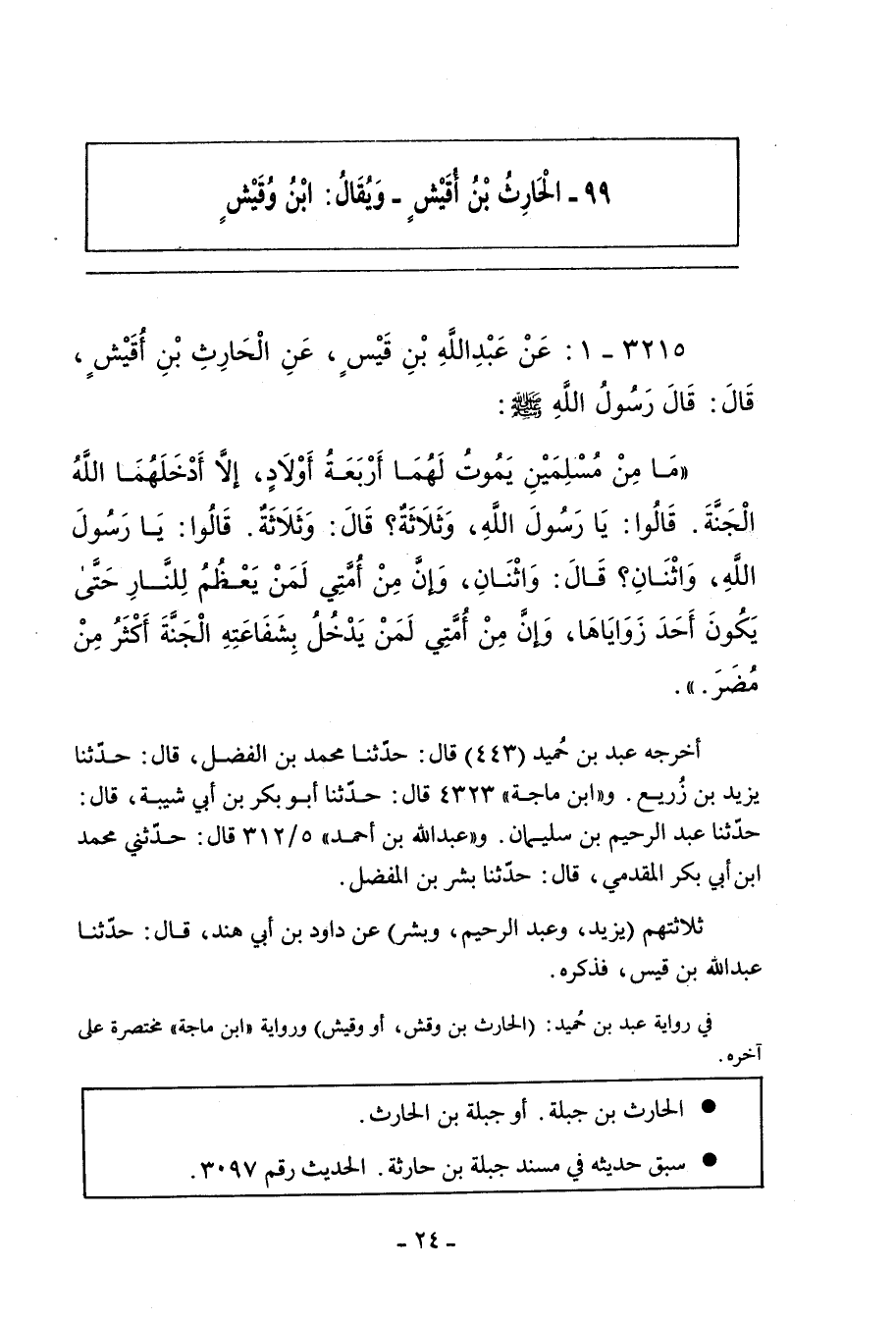 ٣٢١٥ - عَنْ عَبْدِ اللهِ بْنِ قَيْسٍ، عَنِ الْحَارِثِ بْنِ أُقَيْشٍ، قَالَ: قَالَ رَسُولُ اللهِ صلى الله عليه وسلم: