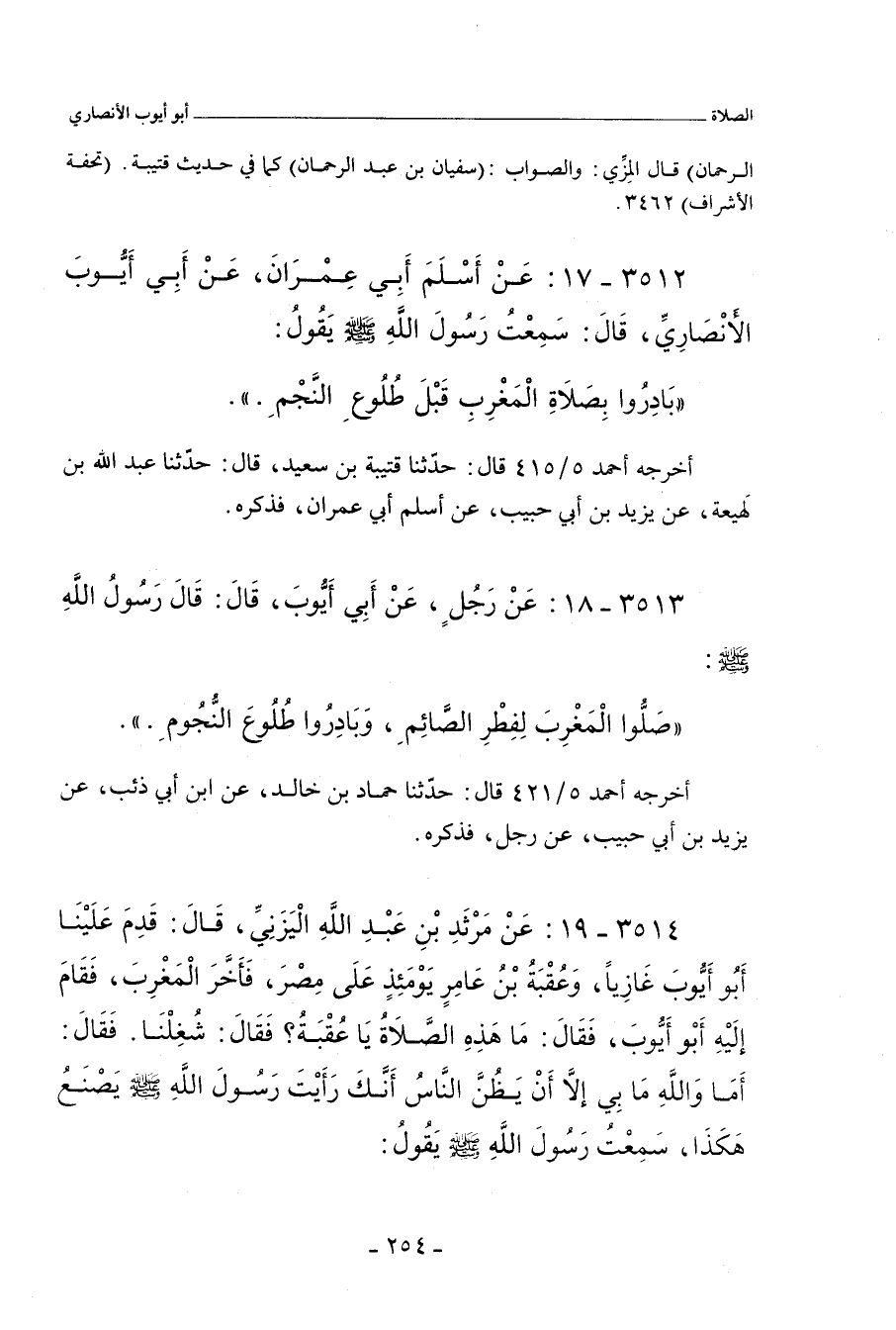 ٣٥١٤ - عَنْ مَرْثَدِ بْنِ عَبْدِ اللهِ الْيَزَنِيِّ، قَالَ: قَدِمَ عَلَيْنَا أَبُو أَيُّوبَ غَازِيًا، وَعُقْبَةُ بْنُ عَامِرٍ يَوْمَئِذٍ عَلَى مِصْرَ، فَأَخَّرَ الْمَغْرِبَ، فَقَامَ إِلَيْهِ أَبُو أَيُّوب، فَقَالَ: مَا هَذِهِ الصَّلَاةُ يَا عُقْبَةُ؟ فَقَالَ: شُغِلْنَا. فَقَالَ: أَمَا وَاللهِ، مَا بِي إِلَاّ أَنْ يَظُنَّ النَّاسُ أَنَّكَ رَأَيْتَ رَسُولَ اللهِ صلى الله عليه وسلم يَصْنَعُ هَكَذَا، سَمِعْتُ رَسُولَ اللهِ صلى الله عليه وسلم يَقُولُ:
