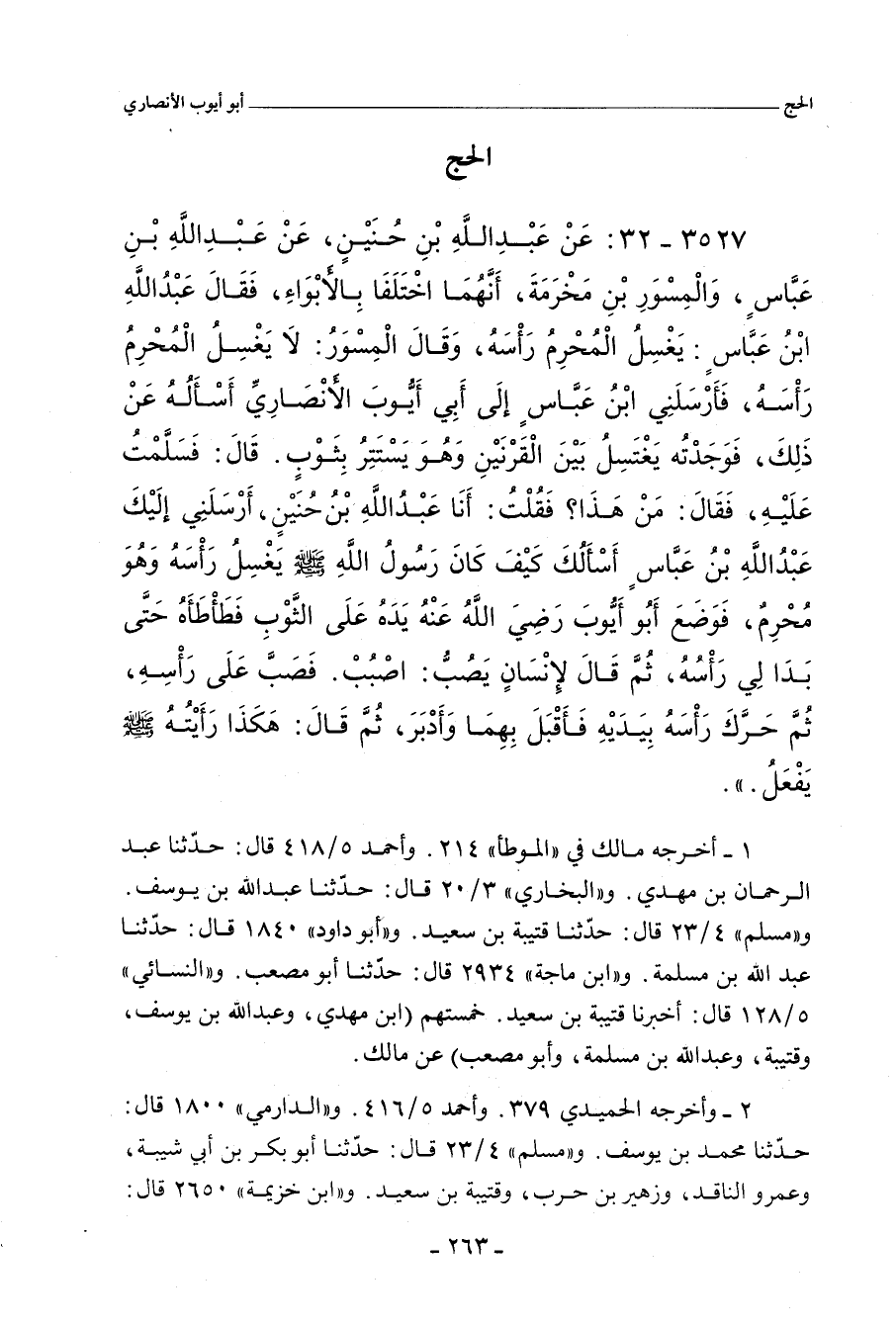 ٣٥٢٧ - عَنْ عَبْدِ اللهِ بْنِ حُنَيْنٍ، عَنْ عَبْدِ اللهِ بْنِ عَبَّاسٍ، وَالْمِسْوَرِ بْنِ مَخْرَمَةَ، أَنَّهُمَا اخْتَلَفَا بِالأَبْوَاءِ، فَقَالَ عَبْدُ اللهِ بْنُ عَبَّاسٍ: يَغْسِلُ الْمُحْرِمُ رَأْسَهُ، وَقَالَ الْمِسْوَرُ: لَا يَغْسِلُ الْمُحْرِمُ رَأْسَهُ، فَأَرْسَلَنِي ابْنُ عَبَّاسٍ إِلَى أَبِي أَيُّوبَ الأَنْصَارِيِّ، أَسْأَلُهُ عَنْ ذَلِكَ، فَوَجَدْتُهُ يَغْتَسِلُ بَيْنَ الْقَرْنَيْنِ، وَهُوَ يَسْتَتِرُ بِثَوْبٍ، قَالَ: فَسَلَّمْتُ عَلَيْهِ، فَقَالَ: مَنْ هَذَا؟ فَقُلْتُ: أَنَا عَبْدُ اللهِ بْنُ حُنَيْنٍ، أَرْسَلَنِي إِلَيْكَ عَبْدُ اللهِ بْنُ عَبَّاسٍ، أَسْأَلُكَ كَيْفَ كَانَ رَسُولُ اللهِ صلى الله عليه وسلم يَغْسِلُ رَأْسَهُ، وَهُوَ مُحْرِمٌ، فَوَضَعَ أَبُو أَيُّوب، رَضِيَ اللهُ عَنْهُ، يَدَهُ عَلَى الثَّوْبِ، فَطَأْطَأَهُ، حَتَّى بَدَا لِي رَأْسُهُ، ثُمَّ قَالَ لإِنْسَانٍ يَصُبُّ: اصْبُبْ، فَصَبَّ عَلَى رَأْسِهِ، ثُمَّ حَرَّكَ رَأْسَهُ بِيَدَيْهِ، فَأَقْبَلَ بِهِمَا وَأَدْبَرَ، ثُمَّ قَالَ: هَكَذَا رَأَيْتُهُ صلى الله عليه وسلم يَفْعَلُ.