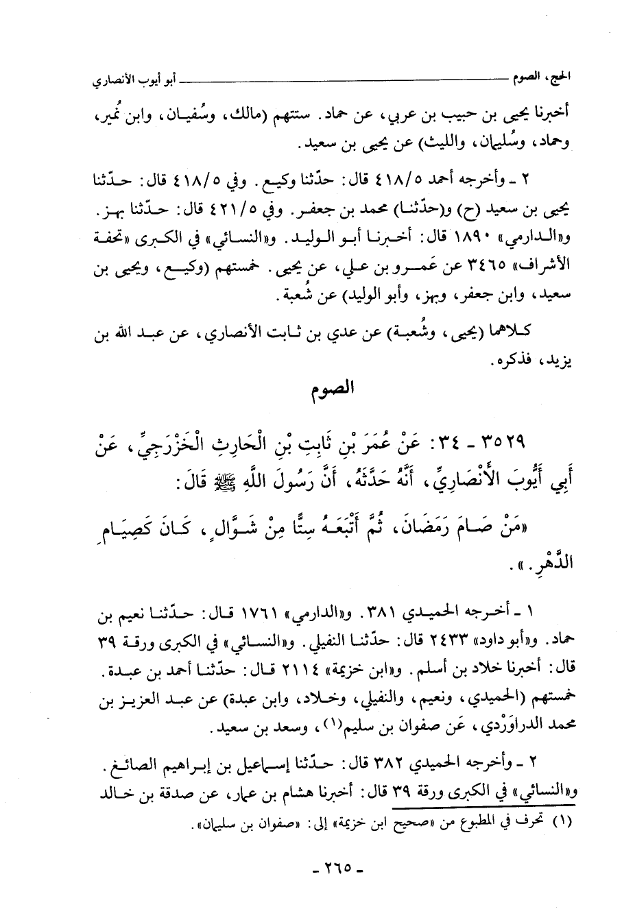 أخرجه الحُمَيْدِي ٣٨١ قال: حدَّثنا عَبْد العَزِيز بن مُحَمد الدَّرَاوَرْدِي، عن صَفْوَان بن سُلَيْم، وسَعْد بن سَعِيد. وفي (٣٨٢) قال: حدَّثنا إِسْمَاعِيل بن إبراهيم الصَّائِغ، عن يَحيى بن سَعِيد. و"أحمد" ٥/ ٤١٧ (٢٣٩٣٠) قال: حدَّثنا أبو مُعَاوِيَة، حدَّثنا سَعْد بن سَعِيد. وفي ٥/ ٤١٩ (٢٣٩٥٢) قال: حدَّثنا مُحَمد بن جَعْفَر، حدَّثنا شُعْبة، قال: سَمِعْتُ وَرْقَاء يُحَدِّث، عن سَعْد بن سَعِيد. وفي (٢٣٩٥٧) قال: حدَّثنا ابن نُمَيْر، حدَّثنا سَعْد بن سَعِيد الأَنْصَارِي، أخو يَحيى بن سَعِيد. و"عَبد بن حُميد" ٢٢٨ قال: حدَّثني مُحَاضِر بن المُوَرِّع، حدَّثنا سَعْد بن سَعِيد. و"الدارِمِي" ١٧٥٤ قال: حدَّثنا نُعَيْم بن حَمَّاد، حدَّثنا عَبْد العَزِيز بن مُحَمد، حدَّثنا صَفْوَان، وسَعْد بن بن سَعِيد. و"مسلم" ٣/ ١٦٩ (٢٧٢٨) قال: حدَّثنا يَحيى بن أَيُّوب، وقُتَيْبَة بن سَعِيد، وعلي بن حُجْر، جميعًا عن إِسْمَاعِيل، قال ابن أَيُّوب: حدَّثنا إِسْمَاعِيل بن جَعْفَر، أخبرني سَعْد بن سَعِيد بن قَيْس. وفي (٢٧٢٩) قال: حدَّثنا ابن نُمَيْر، حدَّثنا أَبِي، حدَّثنا سَعْد بن سَعِيد، أخو يَحيى بن سَعِيد. وفي (٢٧٣٠) قال: حدَّثناه أبو بَكْر بن أَبِي شَيْبَة، حدَّثنا عَبْد اللهِ ابن المُبَارك، عن سَعْد بن سَعِيد. و"أبو داود" ٢٤٣٣ قال: حدَّثنا النُّفَيْلِي، حدَّثنا عَبْد العَزِيز بن مُحَمد، عن صَفْوَان بن سُلَيْم، وسَعْد بن سَعِيد. و"ابن ماجة" ١٧١٦ قال: حدَّثنا علي بن مُحَمد، حدَّثنا عَبْد اللهِ بن نُمَيْر،