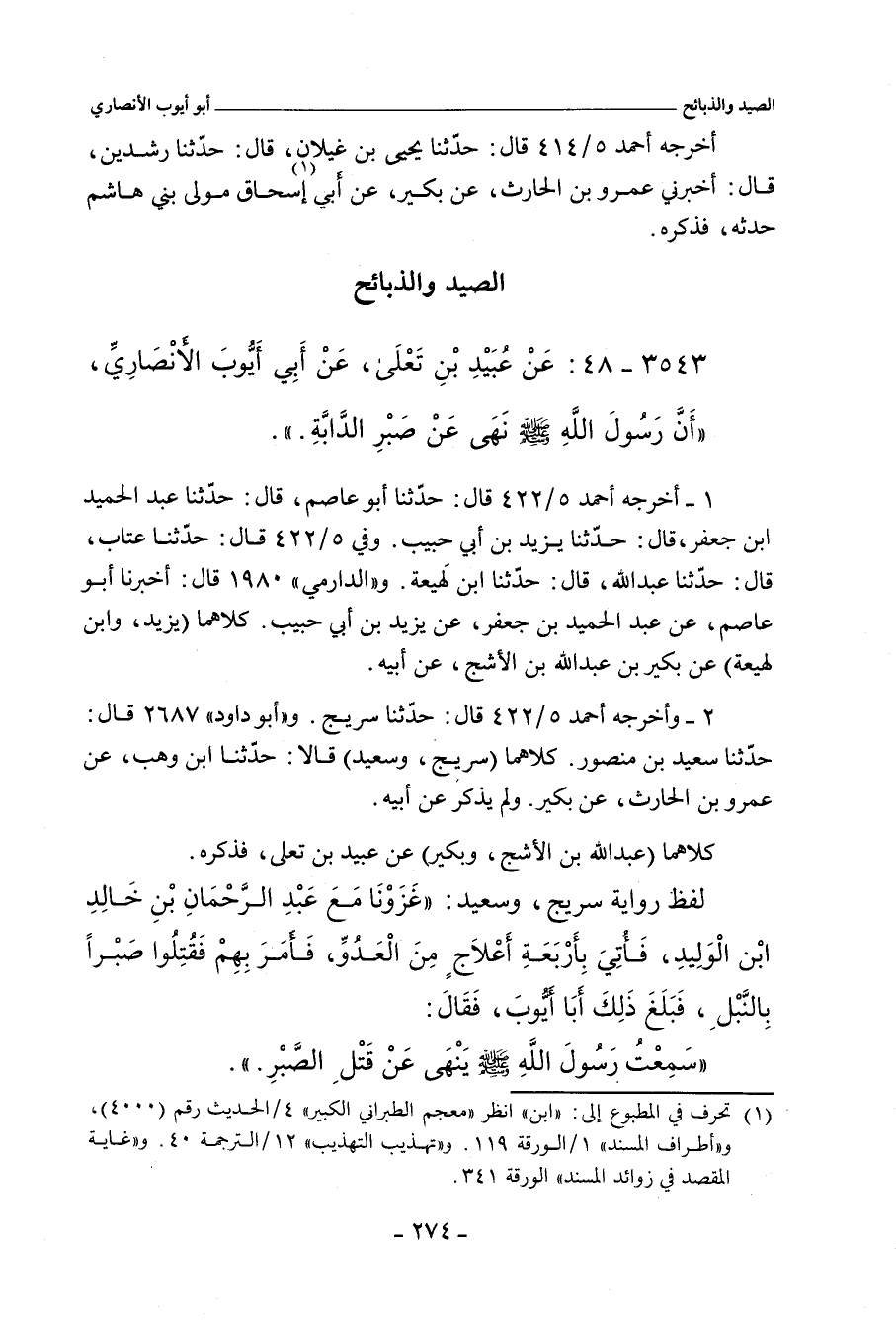 ٣٥٤٣ - عَنْ عُبَيْدِ بْنِ تِعْلَى، قَالَ: غَزَوْنَا أَرْضَ الرُّومِ، وَمَعَنَا أَبُو أَيُّوبَ الأَنْصَارِيَّ، صَاحِبُ رَسُولِ اللهِ صلى الله عليه وسلم، وَعَلَى النَّاسِ عَبْدُ الرَّحْمَانِ بْنُ خَالِدِ بْنِ الوَلِيدِ، فِي زَمَانِ مُعَاوِيَةَ , فَبَيْنَا نَحْنُ عِنْدَهُ إذْ أَتَاهُ رَجُلٌ، فَقَالَ: أُتِيَ الأَمِيرُ بِأَعْلَاجٍ أَرْبَعَةٍ، فَأَمَرَ بِهِمْ فَصُبِرُوا، يُرْمَوْنَ بِالنَّبْلِ، حَتَّى قُتِلُوا , قَالَ: فَقَامَ أَبُو أَيُّوبَ فَزِعًا، حَتَّى أَتَى عَبْدَ الرَّحْمَانِ، فَقَالَ: أَصَبَرْتُمْ؟