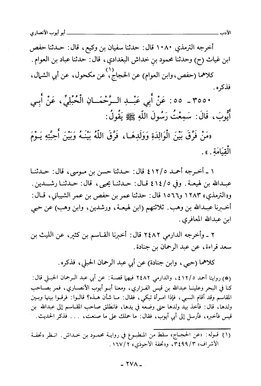 - قال أبو عِيسَى التِّرْمِذِي: وروى هذا الحديث هُشَيْم، ومُحَمد بن يَزِيد الواسطي، وأبو مُعَاوِيَة، وغير واحدٍ، عن الحَجَّاج، عن مَكْحُول، عن أَبِي أَيُّوب، ولم يذكروا فيه: عن أَبِي الشِّمال)، وحديث حَفْص بن غِيَاث، وعَبَّاد بن العَوَّام أصح.