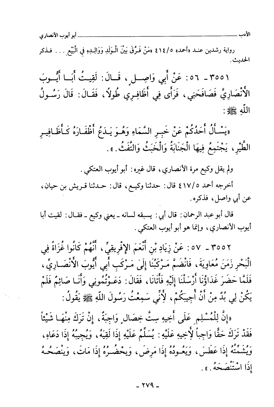 ٣٥٥١ - عَنْ أَبِي وَاصِلٍ، قَالَ: لَقِيتُ أَبَا أَيُّوبَ الأَنْصَارِيَّ، فَصَافَحَنِي، فَرَأَى فِي أَظْفَارِي طُولاً، فَقَالَ: قَالَ رَسُولُ اللهِ صلى الله عليه وسلم: