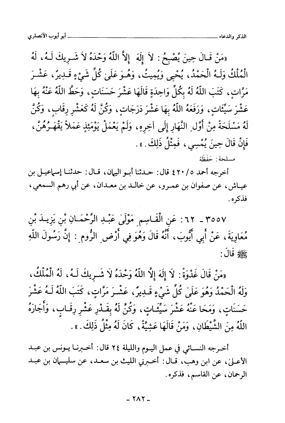 مَنْ قَالَ حِينَ يُصْبِحُ: لَا إِلَهَ إِلَاّ اللهُ، وَحْدَهُ لَا شَرِيكَ لَهُ، لَهُ الْمُلْكُ، وَلَهُ الْحَمْدُ، يُحْيِي وَيُمِيتُ، وَهُوَ عَلَى كُلِّ شَيْءٍ قَدِيرٌ، عَشْرَ مَرَّاتٍ، كَتَبَ اللهُ لَهُ بِكُلِّ وَاحِدَةٍ قَالَهَا عَشْرَ حَسَنَاتٍ، وَحَطَّ اللهُ عَنْهُ بِهَا عَشْرَ سَيِّئَاتٍ، وَرَفَعَهُ اللهُ بِهَا عَشْرَ دَرَجَاتٍ، وَكُنَّ لَهُ كَعَشْرِ رِقَابٍ، وَكُنَّ لَهُ مَسْلَحَةً مِنْ أَوَّلِ النَّهَارِ إِلَى آخِرِهِ، وَلَمْ يَعْمَلْ يَوْمَئِذٍ عَمَلاً يَقْهَرُهُنَّ، فَإِنْ قَالَ حِينَ يُمْسِي، فَمِثْلُ ذَلِكَ.