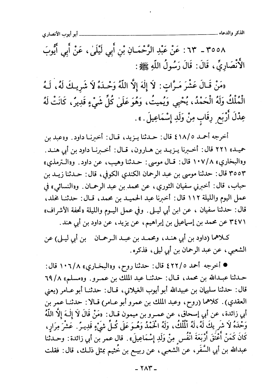 مَنْ قَالَ عَشْرَ مَرَّاتٍ: لَا إِلَهَ إِلَاّ اللهُ، وَحْدَهُ لَا شَرِيكَ لَهُ، لَهُ الْمُلْكُ، وَلَهُ الْحَمْدُ، يُحْيِي وَيُمِيتُ، وَهُوَ عَلَى كُلِّ شَيْءٍ قَدِيرٌ، كَانَتْ لَهُ عَِدْلَ أَرْبَعِ رِقَابٍ مِنْ وَلَدِ إِسْمَاعِيل.