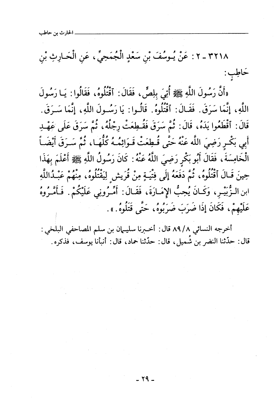 أَنَّ رَسُولَ اللهِ صلى الله عليه وسلم أُتِيَ بِلِصٍّ، فَقَالَ: اقْتُلُوهُ، فَقَالُوا: يَا رَسُولَ اللهِ، إِنَّمَا سَرَقَ. فَقَالَ: اقْتُلُوهُ. قَالُوا: يَا رَسُولَ اللهِ، إِنَّمَا سَرَقَ. قَالَ: اقْطَعُوا يَدَهُ، قَالَ: ثُمَّ سَرَقَ فَقُطِعَتْ رِجْلُهُ، ثُمَّ سَرَقَ عَلَى عَهْدِ أَبِي بَكْرٍ، رَضِيَ اللَّهُ عَنْهُ، حَتَّى قُطِعَتْ قَوَائِمُهُ كُلُّهَا، ثُمَّ سَرَقَ أَيْضًا الْخَامِسَةَ، فَقَالَ أَبُو بَكْرٍ، رَضِيَ اللَّهُ عَنْهُ: كَانَ رَسُولُ اللَّهُ صلى الله عليه وسلم أَعْلَمَ بِهَذَا حِينَ قَالَ: اقْتُلُوهُ، ثُمَّ دَفَعَهُ إِلَى فِتْيَةٍ مِنْ قُرَيْشٍ لِيَقْتُلُوهُ، مِنْهُمْ عَبْدُ اللهِ بْنُ الزُّبَيْرِ، وَكَانَ يُحِبُّ الإِمَارَةَ، فَقَالَ: أَمِّرُونِي عَلَيْكُمْ. فَأَمَّرُوهُ عَلَيْهِمْ، فَكَانَ إِذَا ضَرَبَ ضَرَبُوهُ، حَتَّى قَتَلُوهُ.