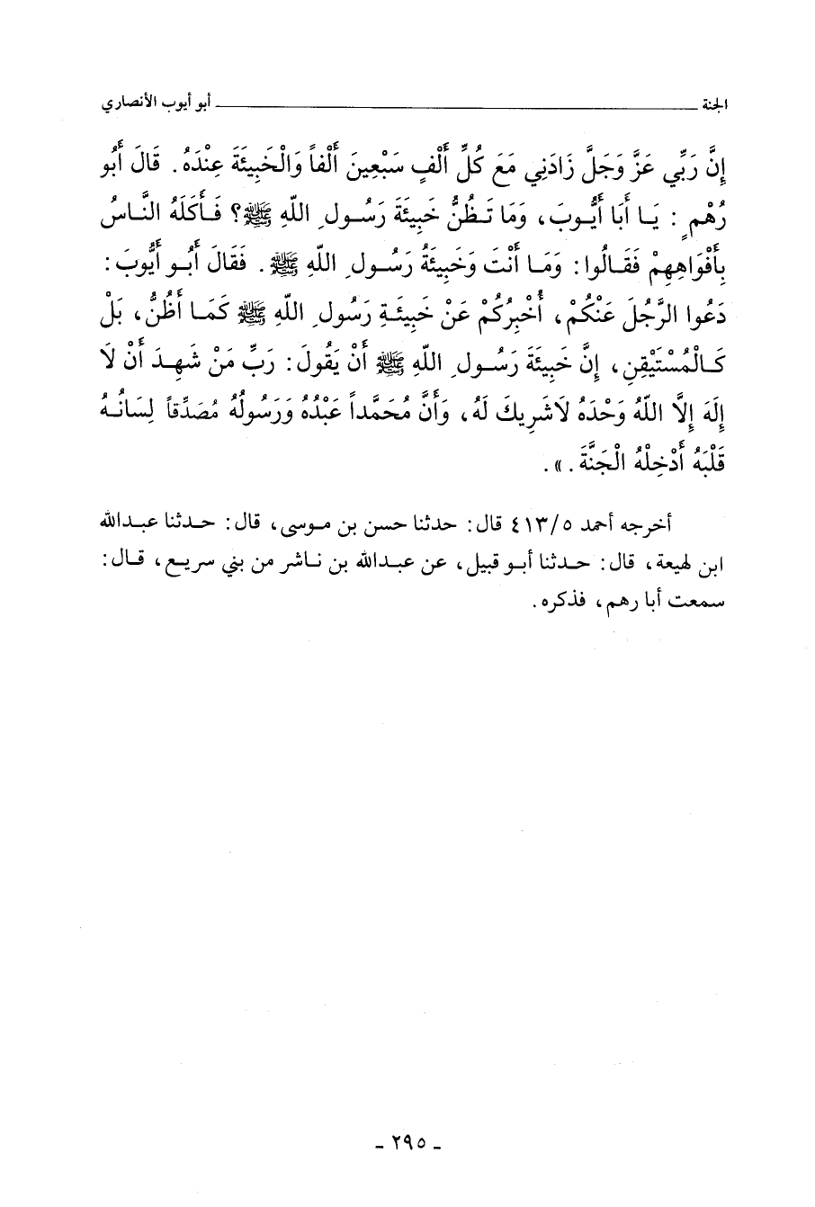 قَالَ أَبُو رُهْمٍ: يَا أَبَا أَيُّوبَ، وَمَا تَظُنُّ خَبِيئَةَ رَسُولِ اللهِ صلى الله عليه وسلم؟ فَأَكَلَهُ النَّاسُ بِأَفْوَاهِهِمْ، فَقَالُوا: وَمَا أَنْتَ وَخَبِيئَةَ رَسُولِ اللهِ صلى الله عليه وسلم؟ فَقَالَ أَبُو أَيُّوب: دَعُوا الرَّجُلَ عَنْكُمْ، أُخْبِرْكُمْ عَنْ خَبِيئَةِ رَسُولِ اللهِ صلى الله عليه وسلم كَمَا أَظُنُّ، بَلْ كَالْمُسْتَيْقِنِ، إِنَّ خَبِيئَةَ رَسُولِ اللهِ صلى الله عليه وسلم أَنْ يَقُولَ: رَبِّ مَنْ شَهِدَ أَنْ لَا إِلَهَ إِلَاّ اللهُ، وَحْدَهُ لَا شَرِيكَ لَهُ، وَأَنَّ مُحَمَّدًا عَبْدُهُ وَرَسُولُهُ، مُصَدِّقًا لِسَانَهُ قَلْبُهُ، فَأَدْخِلْهُ الْجَنَّةَ.