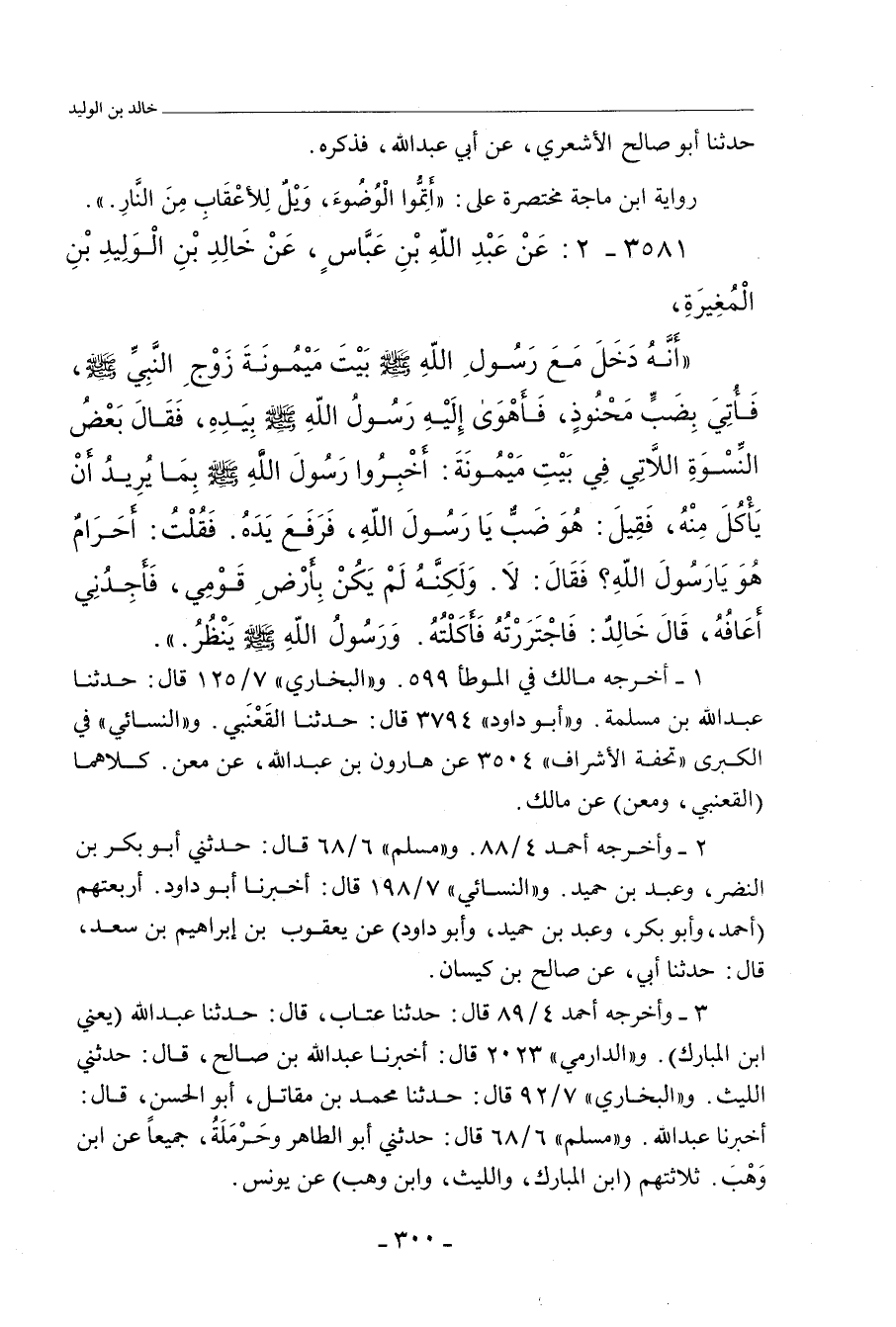 أَنَّهُ دَخَلَ مَعَ رَسُولِ اللهِ صلى الله عليه وسلم بَيْتَ مَيْمُونَةَ، زَوْجِ النَّبِيِّ صلى الله عليه وسلم، فَأُتِيَ بِضَبٍّ مَحْنُوذٍ، فَأَهْوَى إِلَيْهِ رَسُولُ اللهِ صلى الله عليه وسلم بِيَدِهِ، فَقَالَ بَعْضُ النِّسْوَةِ اللَاّتِي فِي بَيْتِ مَيْمُونَةَ: أَخْبِرُوا رَسُولَ اللهِ صلى الله عليه وسلم بِمَا يُرِيدُ أَنْ يَأْكُلَ مِنْهُ، فَقِيلَ: هُوَ ضَبٌّ يَا رَسُولَ اللهِ، فَرَفَعَ يَدَهُ، فَقُلْتُ: أَحَرَامٌ هُوَ، يَا رَسُولَ اللهِ؟ فَقَالَ: لَا، وَلَكِنَّهُ لَمْ يَكُنْ بِأَرْضِ قَوْمِي، فَأَجِدُنِي أَعَافُهُ، قَالَ خَالِدٌ: فَاجْتَرَرْتُهُ فَأَكَلْتُهُ، وَرَسُولُ اللهِ صلى الله عليه وسلم يَنْظُرُ.