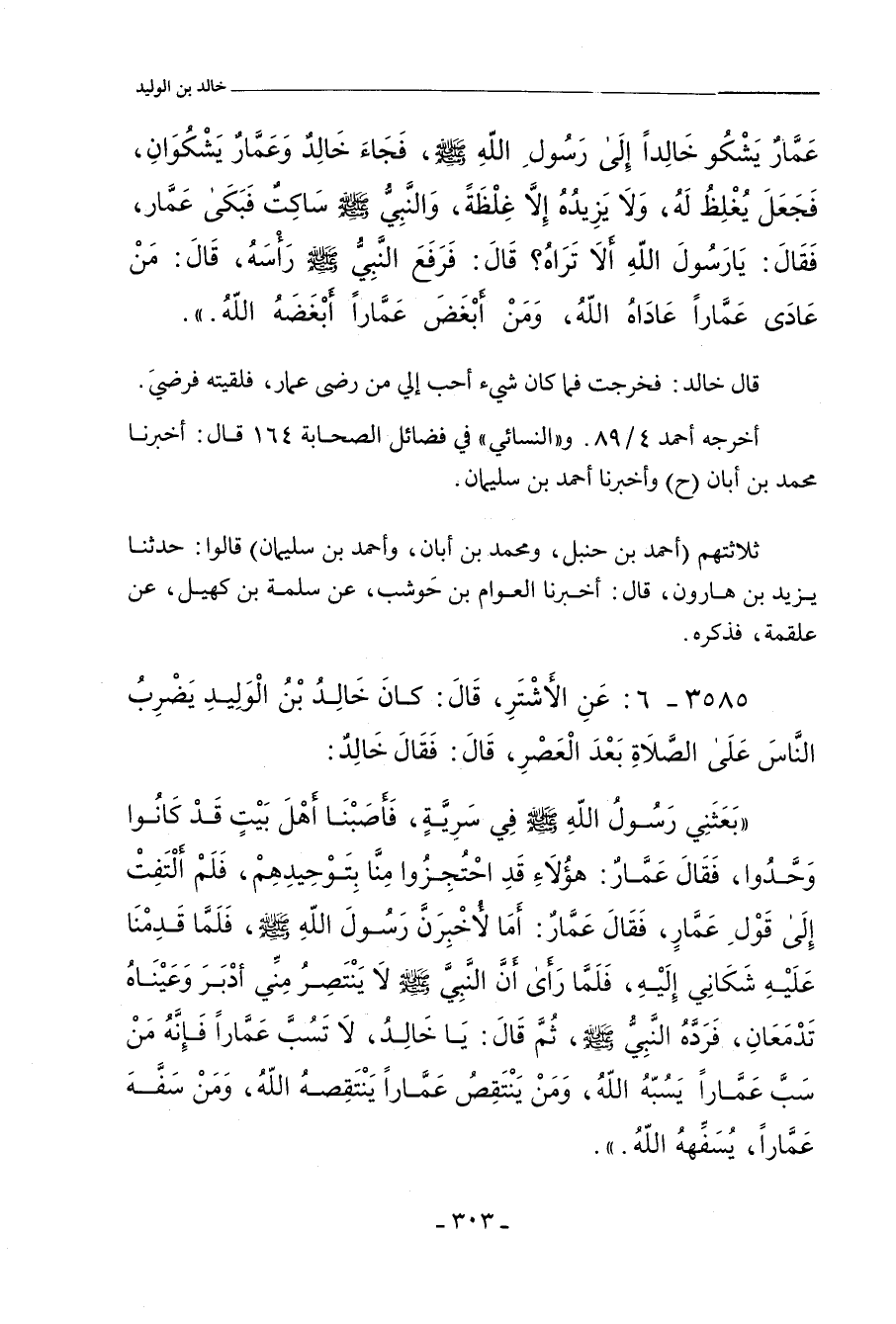 عَمَّارٌ يَشْكُو خَالِدًا إِلَى رَسُولِ اللهِ صلى الله عليه وسلم، فَجَاءَ خَالِدٌ وَعَمَّارٌ يَشْكُوَانِ، فَجَعَلَ يُغْلِظُ لَهُ، وَلَا يَزِيدُهُ إِلَاّ غِلْظَةً، وَالنَّبِيُّ صلى الله عليه وسلم سَاكِتٌ، فَبَكَى عَمَّارٌ، فَقَالَ: يَا رَسُولَ اللهِ، أَلَا تَرَاهُ؟ قَالَ: فَرَفَعَ النَّبِيّ صلى الله عليه وسلم رَأْسَهُ، قَالَ: مَنْ عَادَى عَمَّارًا عَادَاهُ اللهُ، وَمَنْ أَبْغَضَ عَمَّارًا أَبْغَضَهُ اللهُ.