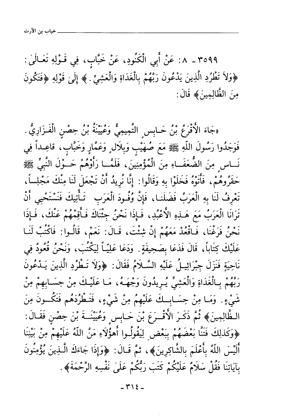 فِي قَوْلِهِ، تَعَالَى: (وَلَا تَطْرُدِ الَّذِينَ يَدْعُونَ رَبَّهُمْ بِالْغَدَاةِ وَالْعَشِيِّ) إِلَى قَوْلِهِ: (فَتَكُونَ مِنَ الظَّالِمِينَ) قَالَ: جَاءَ الأَقْرَعُ بْنُ حَابِسٍ التَّمِيمِيِّ، وَعُيَيْنَةُ بْنُ حِصْنٍ الْفَزَارِيُّ، فَوَجَدُوا رَسُولَ اللهِ صلى الله عليه وسلم مَعَ صُهَيْبٍ، وَبِلَالٍ، وَعَمَّارٍ، وَخَبَّابٍ، قَاعِدًا فِي نَاسٍ مِنَ الضُّعَفَاءِ، مِنَ الْمُؤْمِنِينَ، فَلَمَّا رَأَوْهُمْ حَوْلَ النَّبِيّ صلى الله عليه وسلم حَقَرُوهُمْ، فَأَتَوْهُ، فَخَلَوْا بِهِ، وَقَالُوا: إِنَّا نُرِيدُ أَنْ تَجْعَلَ لَنَا مِنْكَ مَجْلِسًا تَعْرِفُ لَنَا بِهِ الْعَرَبُ فَضْلَنَا، فَإِنَّ وُفُودَ الْعَرَبِ تَأْتِيكَ، فَنَسْتَحْيِي أَنْ تَرَانَا الْعَرَبُ مَعَ هَذِهِ الأَعْبُدِ، فَإِذَا نَحْنُ جِئْنَاكَ، فَأَقِمْهُمْ عَنْكَ، فَإِذَا نَحْنُ فَرَغْنَا، فَاقْعُدْ مَعَهُمْ إِنْ شِئْتَ، قَالَ: نَعَمْ، قَالُوا: فَاكْتُبْ لَنَا عَلَيْكَ كِتَابًا، قَالَ: فَدَعَا بِصَحِيفَةٍ، وَدَعَا عَلِيًّا لِيَكْتُبَ، وَنَحْنُ قُعُودٌ فِي نَاحِيَةٍ، فَنَزَلَ جِبْرَائِيلُ، عَلَيْهِ السَّلام، فَقَالَ: (وَلَا تَطْرُدِ الَّذِينَ يَدْعُونَ رَبَّهُمْ بِالْغَدَاةِ وَالْعَشِيِّ يُرِيدُونَ وَجْهَهُ مَا عَلَيْكَ مِنْ حِسَابِهِمْ مِنْ شَيْءٍ وَمَا مِنْ حِسَابِكَ عَلَيْهِمْ مِنْ شَيْءٍ فَتَطْرُدَهُمْ فَتَكُونَ مِنَ الظَّالِمِينَ) ثُمَّ ذَكَرَ الأَقْرَعَ بْنَ حَابِسٍ، وَعُيَيْنَةَ بْنَ حِصْنٍ، فَقَالَ: (وَكَذَلِكَ فَتَنَّا بَعْضَهُمْ بِبَعْضٍ لِيَقُولُوا أَهَؤُلَاءِ مَنَّ اللهُ عَلَيْهِمْ مِنْ بَيْنِنَا أَلَيْسَ اللهُ بِأَعْلَمَ بِالشَّاكِرِينَ)، ثُمَّ قَالَ: (وَإِذَا جَاءَكَ الَّذِينَ يُؤْمِنُونَ بِآيَاتِنَا فَقُلْ سَلَامٌ