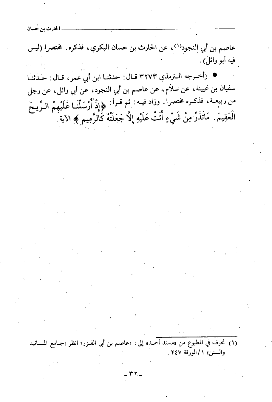 كلاهما (أحمد، وابن أَبي شَيْبَة) قالا: حدَّثنا أبو بَكْر بن عَيَّاش، قال: حَدَّثَنَا عَاصِمُ بْنُ أَبِي النَّجُودِ، عَنِ الْحَارِثِ بْنِ حَسَّانَ الْبَكْرِيِّ، قَالَ: