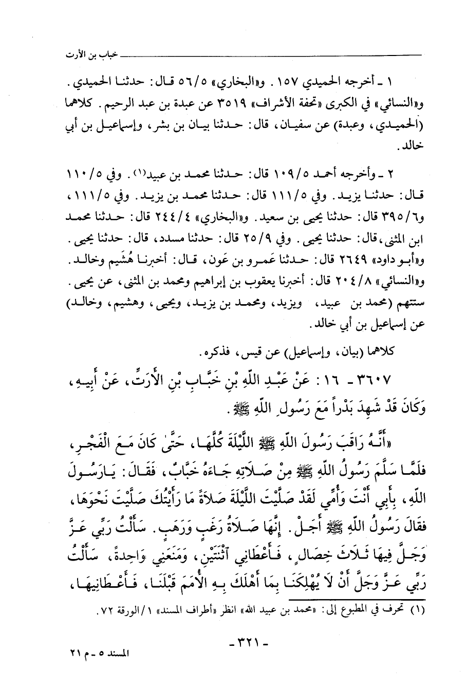 ٣٦٠٧ - عَنْ عَبْدِ اللهِ بْنِ خَبَّابِ بْنِ الأَرَتِّ، عَنْ أَبِيهِ، وَكَانَ قَدْ شَهِدَ بَدْرًا مَعَ رَسُولِ اللهِ صلى الله عليه وسلم؛