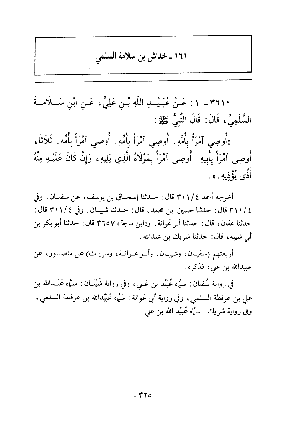 أُوصِي امْرَءًا بِأُمِّهِ، أُوصِي امْرَءًا بِأُمِّهِ، أُوصِي امْرَءًا بِأُمِّهِ، ثَلَاثًا، أُوصِي امْرَءًا بِأَبِيهِ، أُوصِي امْرَءًا بِمَوْلَاهُ الَّذِي يَلِيهِ، وَإِنْ كَانَ عَلَيْهِ مِنْهُ أَذًى يُؤْذِيهِ.