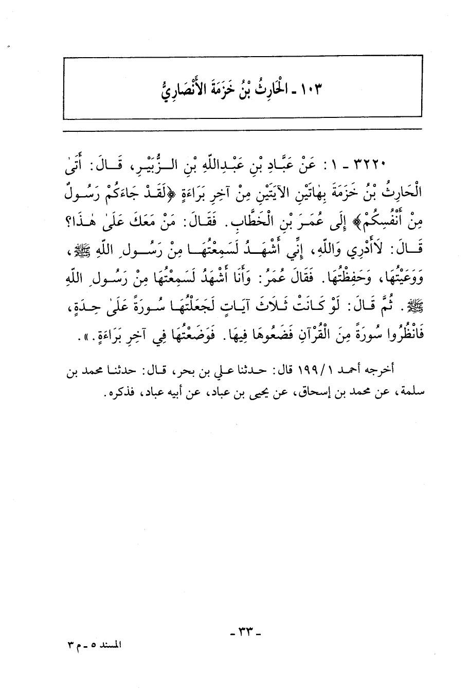 ٣٢٢٠ - عَنْ عَبَّادِ بْنِ عَبْدِ اللهِ بْنِ الزُّبَيْرِ، قَالَ: أَتَى الْحَارِثُ بْنُ خَزَمَةَ بِهَاتَيْنِ الآيَتَيْنِ مِنْ آخِرِ بَرَاءَةَ: (لَقَدْ جَاءَكُمْ رَسُولٌ مِنْ أَنْفُسِكُمْ) إِلَى عُمَرَ بْنِ الْخَطَّابِ. فَقَالَ: مَنْ مَعَكَ عَلَى هَذَا؟ قَالَ: لَا أَدْرِي وَاللهِ، إِلَاّ أَنِّي أَشْهَدُ لَسَمِعْتُهَا مِنْ رَسُولِ اللهِ صلى الله عليه وسلم، وَوَعَيْتُهَا، وَحَفِظْتُهَا. فَقَالَ عُمَرُ: وَأَنَا أَشْهَدُ لَسَمِعْتُهَا مِنْ رَسُولِ اللهِ صلى الله عليه وسلم. ثُمَّ قَالَ: لَوْ كَانَتْ ثَلَاثَ آيَاتٍ، لَجَعَلْتُهَا سُورَةً عَلَى حِدَةٍ، فَانْظُرُوا سُورَةً مِنَ الْقُرْآنِ فَضَعُوهَا فِيهَا، فَوَضَعْتُهَا فِي آخِرِ بَرَاءَةَ.