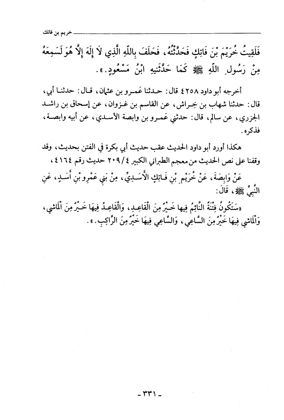 فَلَقِيتُ خُرَيْمَ بْنَ فَاتِكٍ، فَحَدَّثْتُهُ، فَحَلَفَ بِاللهِ الَّذِي لَا إِلَهَ إِلَاّ هُوَ، لَسَمِعَهُ مِنْ رَسُولِ اللهِ صلى الله عليه وسلم، كَمَا حَدَّثَنِيهِ ابْنُ مَسْعُودٍ.