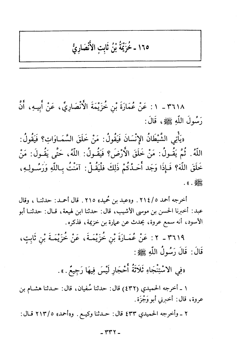 ٣٦١٩ - عَنْ عُمَارَةَ بْنِ خُزَيْمَةَ، عَنْ خُزَيْمَةَ بْنِ ثَابِتٍ، قَالَ: قَالَ رَسُولُ اللهِ صلى الله عليه وسلم: