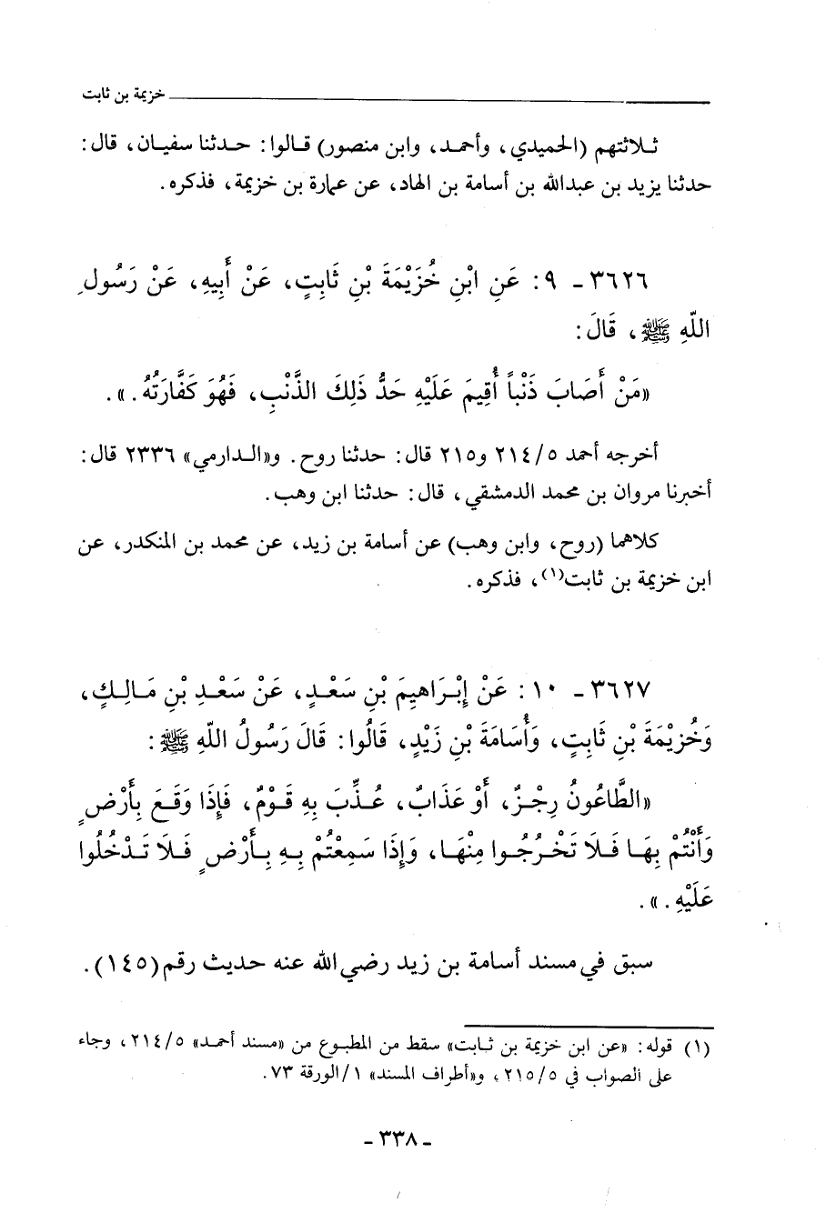 ٣٦٢٦ - عَنِ ابْنِ خُزَيْمَةَ بْنِ ثَابِتٍ، عَنْ أَبِيهِ، عَنْ رَسُولِ اللهِ صلى الله عليه وسلم، قَالَ: