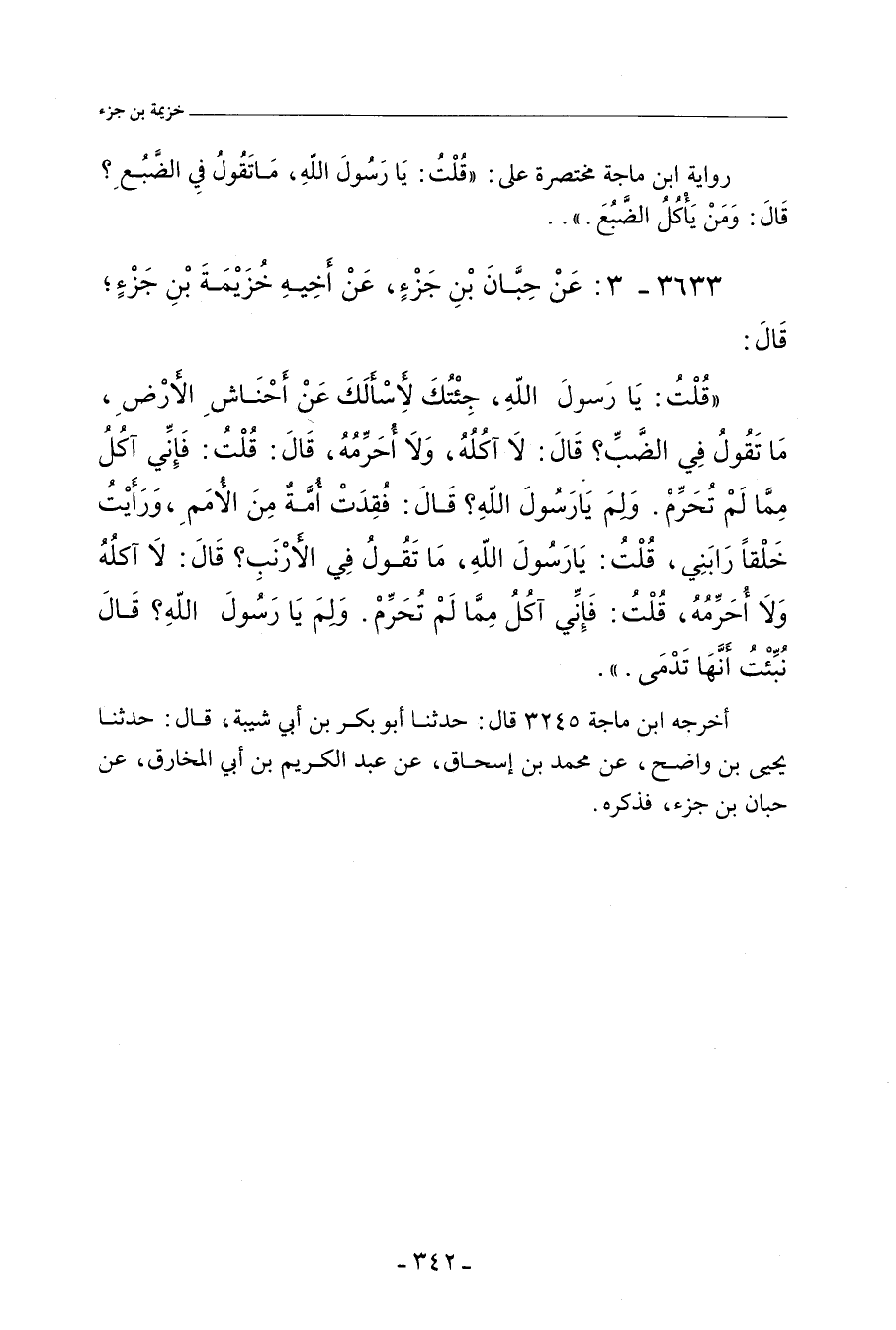 قُلْتُ: يَا رَسُولَ اللهِ، جِئْتُكَ لأَسْأَلَكَ عَنْ أَحْنَاشِ الأَرْضِ، مَا تَقُولُ فِي الضَّبِّ؟ قَالَ: لَا آكُلُهُ وَلَا أُحَرِّمُهُ، قَالَ: قُلْتُ: فَإِنِّي آكُلُ مِمَّا لَمْ تُحَرِّمْ. وَلِمَ يَا رَسُولَ اللهِ؟ قَالَ: فُقِدَتْ أُمَّةٌ مِنَ الأُمَمِ، وَرَأَيْتُ خَلْقًا رَابَنِي، قُلْتُ: يَا رَسُولَ اللهِ، مَا تَقُولُ فِي الأَرْنَبِ؟ قَالَ: لَا آكُلُهُ وَلَا أُحَرِّمُهُ، قُلْتُ: فَإِنِّي آكُلُ مِمَّا لَمْ تُحَرِّمْ. وَلِمَ يَا رَسُولَ اللهِ؟ قَالَ: نُبِّئْتُ أَنَّهَا تَدْمَى.