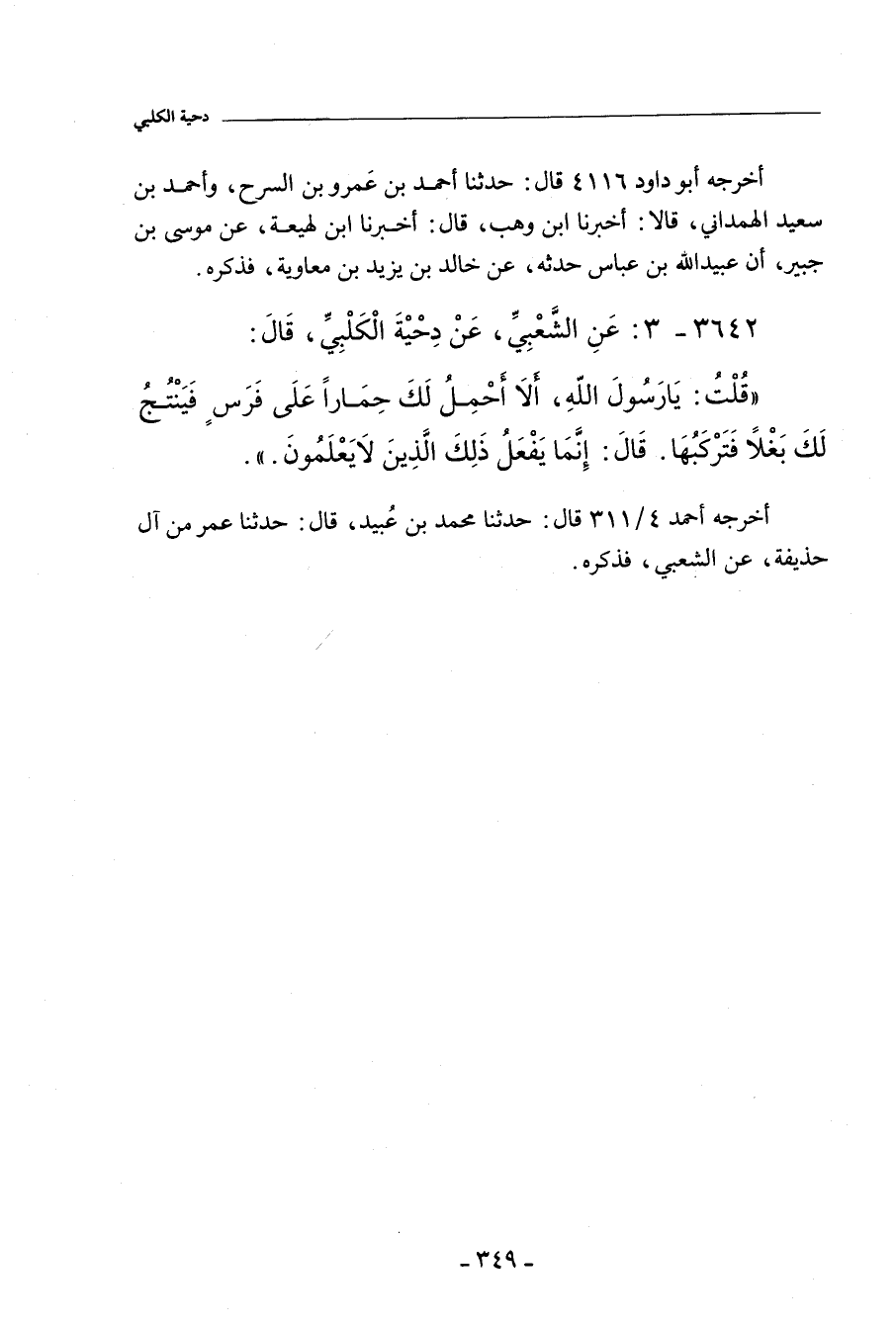قُلْتُ: يَا رَسُولَ اللهِ، أَلَا أَحْمِلُ لَكَ حِمَارًا عَلَى فَرَسٍ، فَيُنْتِجَُ لَكَ بَغْلاً، فَتَرْكَبُهَا؟ قَالَ: إِنَّمَا يَفْعَلُ ذَلِكَ الَّذِينَ لَا يَعْلَمُونَ.