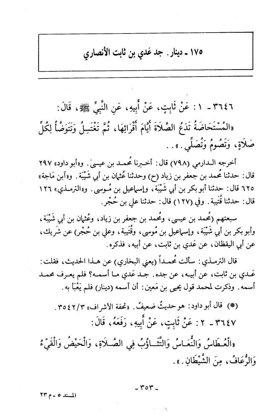 قَالَ الترمذي: سَأَلْتُ مُحَمَّدًا (يعني البخاري) عَنْ هَذَا الْحَدِيثِ , فَقُلْتُ: عَدِىُّ بْنُ ثَابِتٍ , عَنْ أَبِيهِ , عَنْ جَدِّهِ. جَدُّ عَدِىٍّ مَا اسْمُهُ؟ فَلَمْ يَعْرِفْ مُحَمَّدٌ اسْمَهُ. وَذَكَرْتُ لِمُحَمَّدٍ قَوْلَ يَحْيَى بْنِ مَعِينٍ: أَنَّ اسْمَهُ (دِينَارٌ) فَلَمْ يَعْبَأْ بِهِ.
