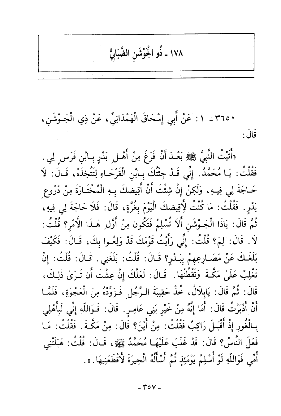 أَتَيْتُ النَّبِيَّ صلى الله عليه وسلم، بَعْدَ أَنْ فَرَغَ مِنْ أَهْلِ بَدْرٍ، بِابْنِ فَرَسٍ لِي، فَقُلْتُ: يَا مُحَمَّدُ، إِنِّي قَدْ جِئْتُكَ بِابْنِ الْقَرْحَاءِ، لِتَتَّخِذَهُ، قَالَ: لَا حَاجَةَ لِي فِيهِ، وَلَكِنْ إِنْ شِئْتَ أَنْ أَقِيضَكَ بِهِ الْمُخْتَارَةَ مِنْ دُرُوعِ بَدْرٍ فَعَلْتُ، فَقُلْتُ: مَا كُنْتُ لأَقِيضَكَ الْيَوْمَ بِغُرَّةٍ، قَالَ: فَلَا حَاجَةَ لِي فِيهِ، ثُمَّ قَالَ: يَا ذَا الْجَوْشَنِ، أَلَا تُسْلِمُ، فَتَكُونَ مِنْ أَوَّلِ هَذَا الأَمْرِ؟ قُلْتُ: لَا، قَالَ: لِمَ؟ قُلْتُ: إِنِّي رَأَيْتُ قَوْمَكَ قَدْ وَلِعُوا بِكَ، قَالَ: فَكَيْفَ بَلَغَكَ عَنْ مَصَارِعِهِمْ بِبَدْرٍ؟ قَالَ: قُلْتُ: قَدْ بَلَغَنِي، قَالَ: قُلْتُ: إِنْ تَغْلِبْ عَلَى مَكَّةَ وَتَقْطُنْهَا، قَالَ: لَعَلَّكَ إِنْ عِشْتَ أَنْ تَرَى ذَلِكَ، قَالَ: ثُمَّ قَالَ: يَا بِلَالُ، خُذْ حَقِيبَةَ الرَّجُلِ، فَزَوِّدْهُ مِنَ الْعَجْوَةِ، فَلَمَّا أَنْ أَدْبَرْتُ، قَالَ: أَمَا إِنَّهُ مِنْ خَيْرِ بَنِي عَامِرٍ، قَالَ: فَوَاللهِ، إِنِّي لَبِأَهْلِي بِالْغَوْرِ، إِذْ أَقْبَلَ رَاكِبٌ، فَقُلْتُ: مِنْ أَيْنَ؟ قَالَ: مِنْ مَكَّةَ، فَقُلْتُ: مَا فَعَلَ النَّاسُ؟ قَالَ: قَدْ غَلَبَ عَلَيْهَا مُحَمد صلى الله عليه وسلم، قَالَ: قُلْتُ: هَبِلَتْنِي أُمِّي، فَوَاللهِ، لَوْ أُسْلِمُ يَوْمَئِذٍ، ثُمَّ أَسْأَلُهُ الْحِيرَةَ لأَقْطَعَنِيهَا.