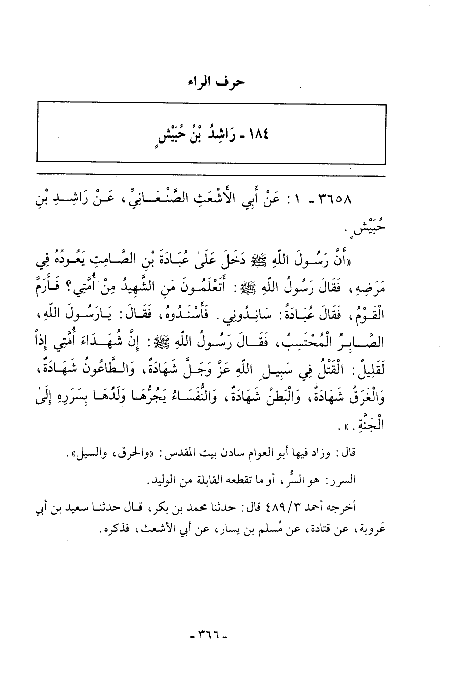 ٣٦٥٨ - عَنْ أَبِى الأَشْعَثِ الصَّنْعَانِىِّ عَنْ رَاشِدِ بْنِ حُبَيْشٍ؛