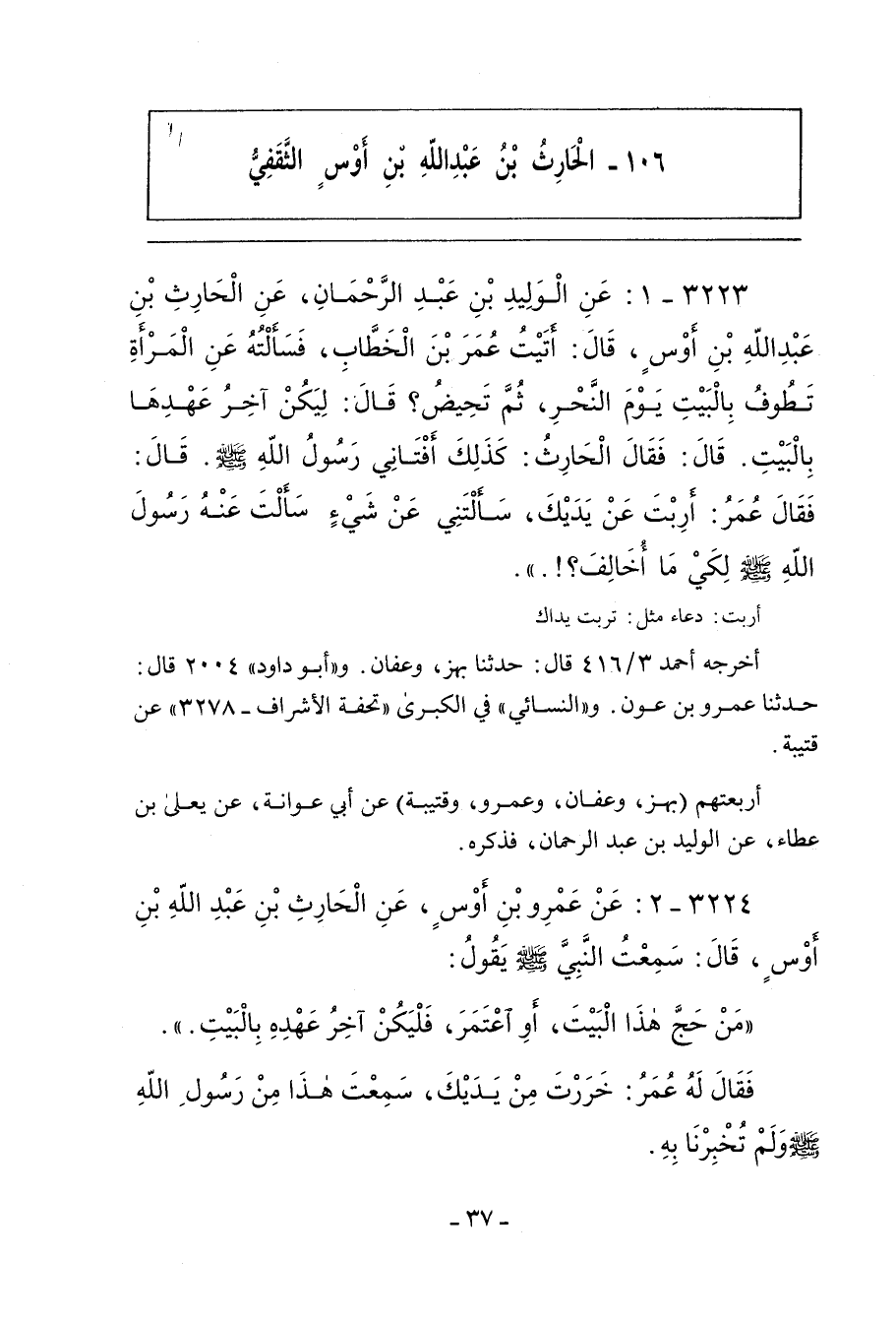 ٣٢٢٣ - عَنِ الْوَلِيدِ بْنِ عَبْدِ الرَّحْمَانِ، عَنِ الْحَارِثِ بْنِ عَبْدِ اللهِ بْنِ أَوْسٍ، قَالَ: أَتَيْتُ عُمَرَ بْنَ الْخَطَّابِ، فَسَأَلْتُهُ عَنِ الْمَرْأَةِ تَطُوفُ بِالْبَيْتِ يَوْمَ النَّحْرِ، ثُمَّ تَحِيضُ؟ قَالَ: لِيَكُنْ آخِرُ عَهْدِهَا بِالْبَيْتِ. قَالَ: فَقَالَ الْحَارِثُ: كَذَلِكَ أَفْتَانِي رَسُولُ اللهِ صلى الله عليه وسلم. قَالَ: فَقَالَ عُمَرُ: أَرِبْتَ عَنْ يَدَيْكَ، سَأَلْتَنِي عَنْ شَيْءٍ سَأَلْتَ عَنْهُ رَسُولَ اللهِ صلى الله عليه وسلم لِكَيْ مَا أُخَالِفَ؟!.