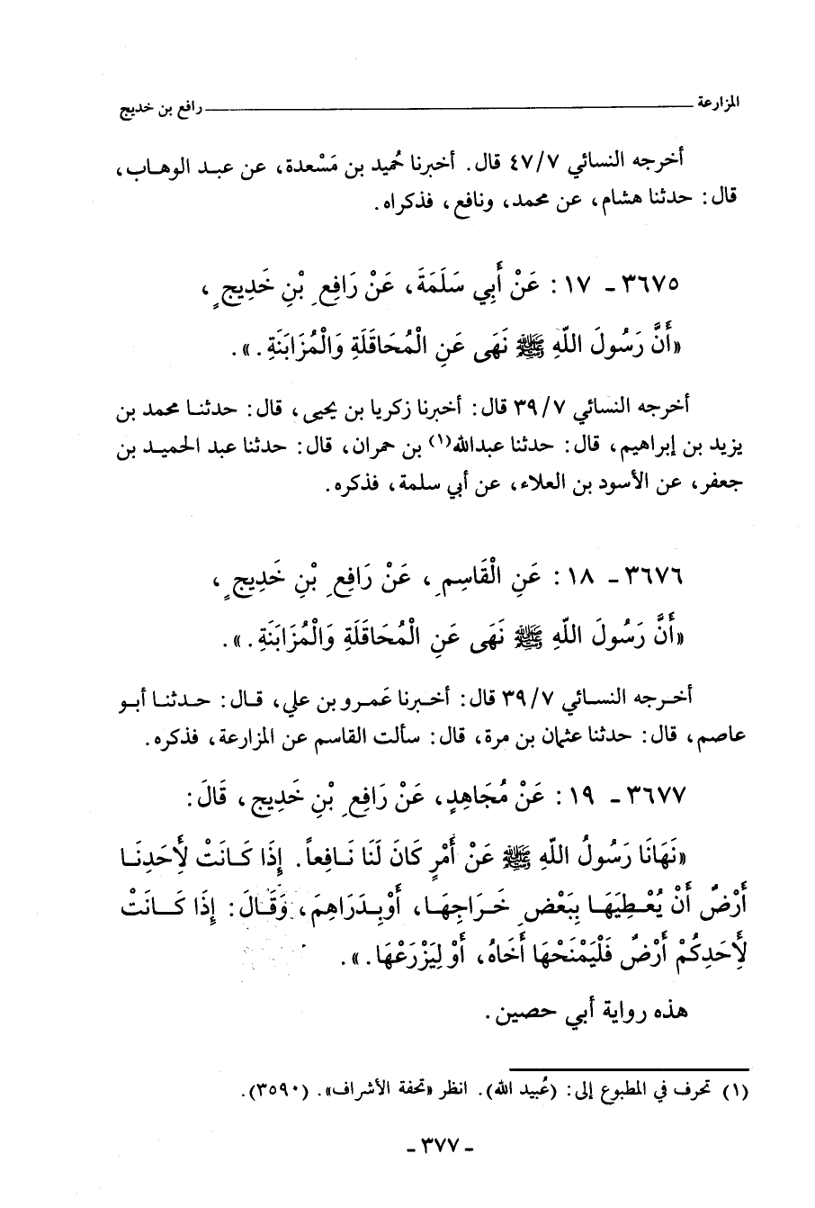 ٣٦٧٧ - عَنْ مُجَاهِدٍ، عَنْ رَافِعِ بْنِ خَدِيجٍ، قَالَ: