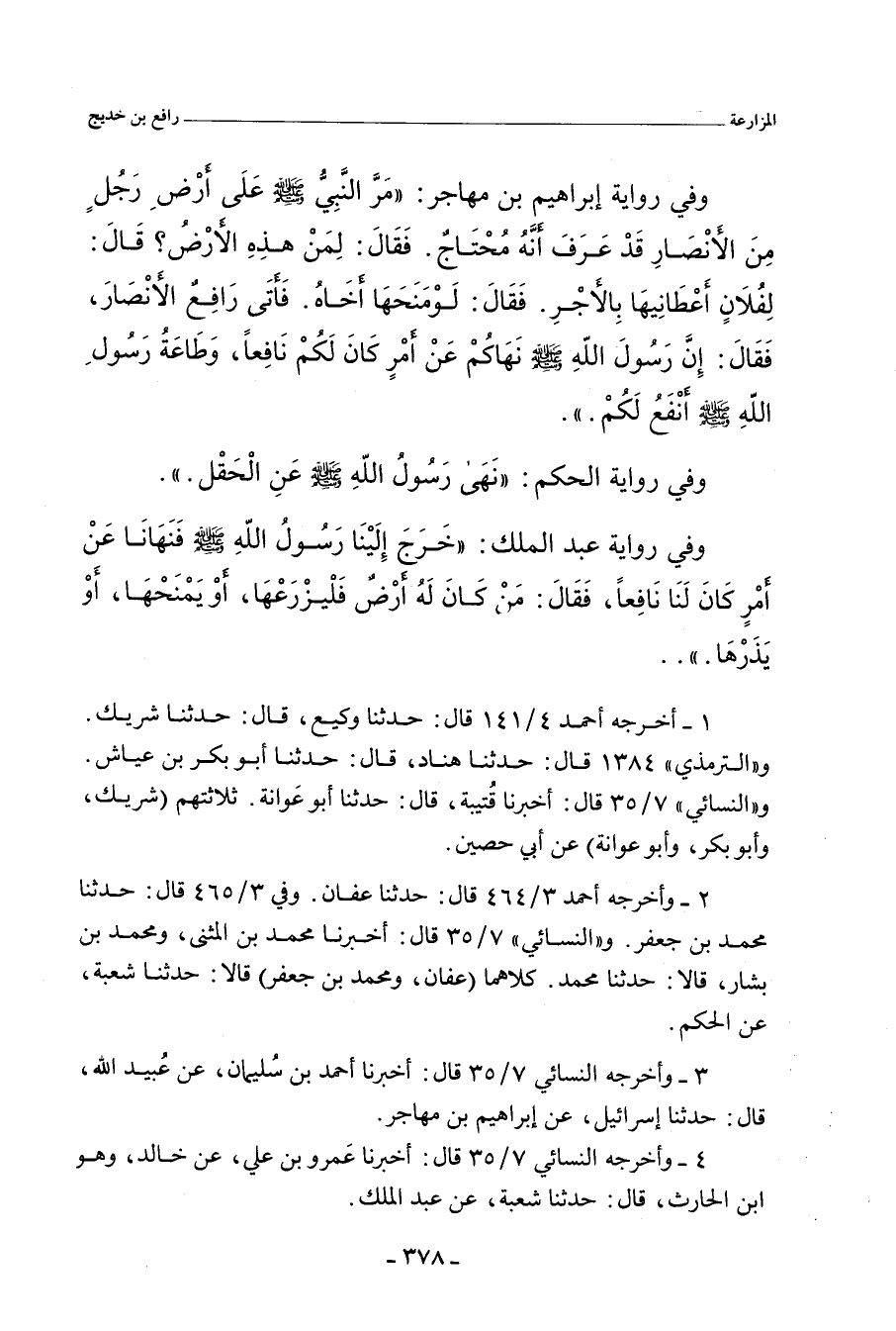 - رواية شَرِيك: نَهَى رَسُولُ اللهِ صلى الله عليه وسلم أَنْ تُسْتَأْجَرَ الأَرْضُ بِالدَّرَاهِمِ الْمَنْقُودَةِ، أَوْ بِالثُّلُثِ وَالرُّبُعِ.