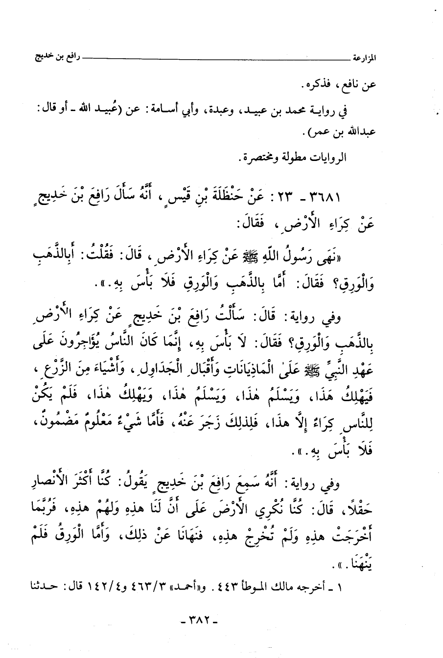 ٣٦٨١ - عَنْ حَنْظَلَةَ بْنِ قَيْسٍ، أَنَّهُ سَأَلَ رَافِعَ بْنَ خَدِيجٍ عَنْ كِرَاءِ الأَرْضِ؟ فَقَالَ: