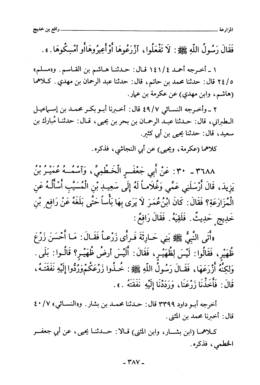 ٣٦٨٨ - عَنْ أَبِي جَعْفَرٍ الخَطْمِيِّ، وَاسْمُهُ عُمَيْرُ بْنُ يَزِيدَ، قَالَ: أَرْسَلَنِي عَمِّي، وَغُلَامًا لَهُ، إِلَى سَعِيدِ بْنِ المُسَيَّبِ، أَسْأَلُهُ عَنِ الْمُزَارَعَةِ، فَقَالَ: كَانَ ابْنُ عُمَرَ لَا يَرَى بِهَا بَأْسًا، حَتَّى بَلَغَهُ عَنْ رَافِعِ بْنِ خَدِيجٍ حَدِيثٌ، فَلَقِيَهُ، فَقَالَ رَافِعٌ: